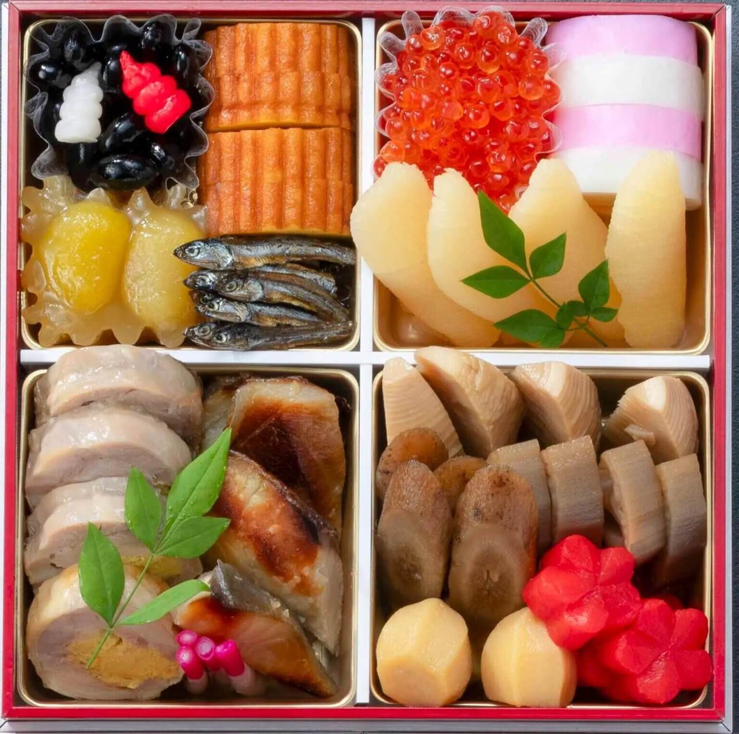 黒豆/紅白千代呂木/柚子伊達巻き/栗きんとん/田作り/いくら油漬け/蒲鉾(紅白)/数の子/鶏けんちん巻き/白ひらす西京焼/はじかみ/煮物(竹の子くし)/煮物(牛蒡)/煮物(蓮根)/煮物(梅花人参)/煮物(豆くわい)