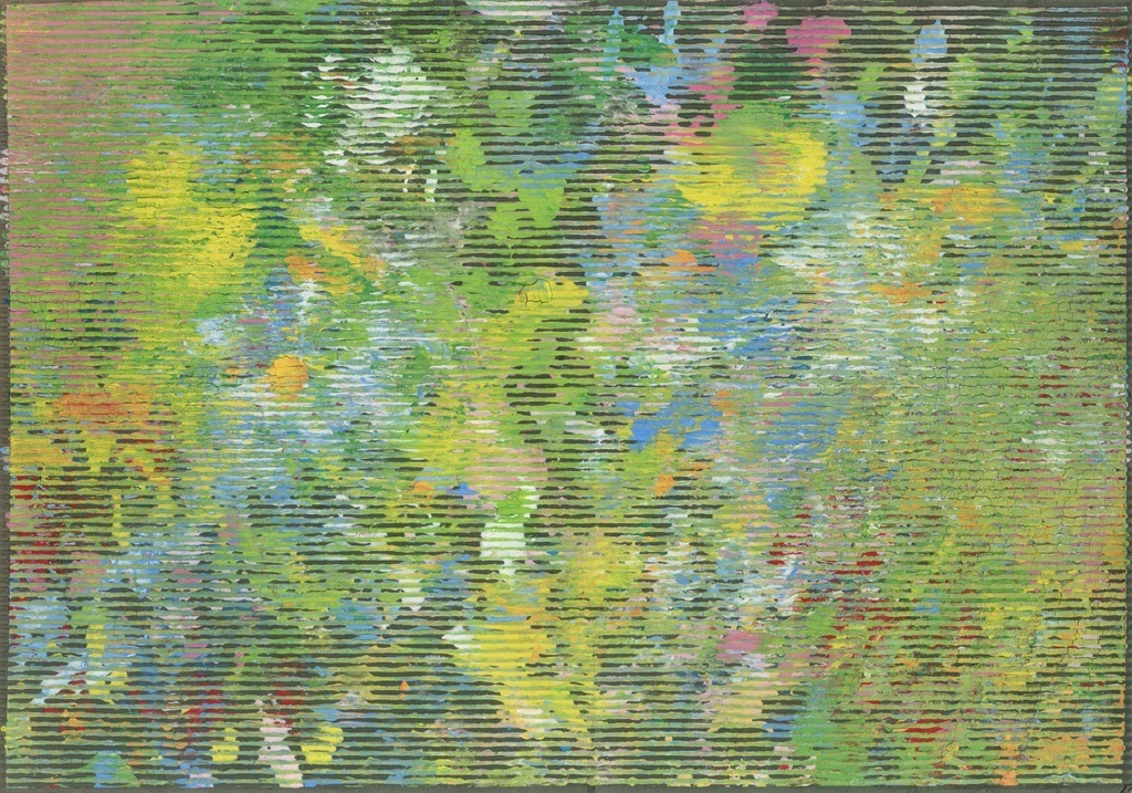 はじまりは、両手にたっぷりの絵の具をつけること。キャンバスに向かい、大きく指を広げ叩くように描いていく。音楽が大好きで、手拍子が響く賑やかな空間や、大好きな音楽が流れる環境を好み、全身でリズムを取りながら制作するその姿はまるでドラマーのよう。利き手の左手で強く叩いた跡が残ることもあり、そこに生まれる形や質感も作品の一部となる。モチーフは楽しかった思い出や人との関わりで、出来上がった作品からは、たくさんの音が聞こえてくるようだ。