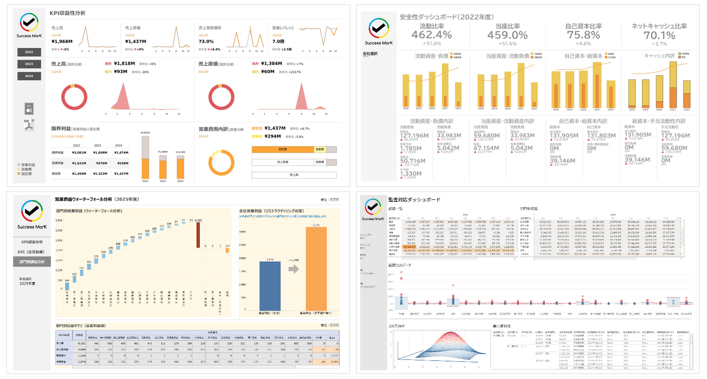 Tableauをベースにした柔軟な可視化機能により、売上推移・費用構成・キャッシュフローなどをリアルタイムで把握可能。経営者が“感覚”ではなく“データ”に基づいた意思決定を行える環境を提供します。