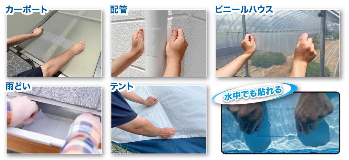 水を一切通さない超強力防水タイプで、超強力の粘着剤が凹凸面にも強力接着します。