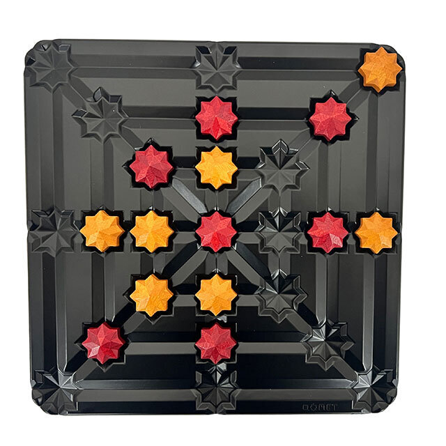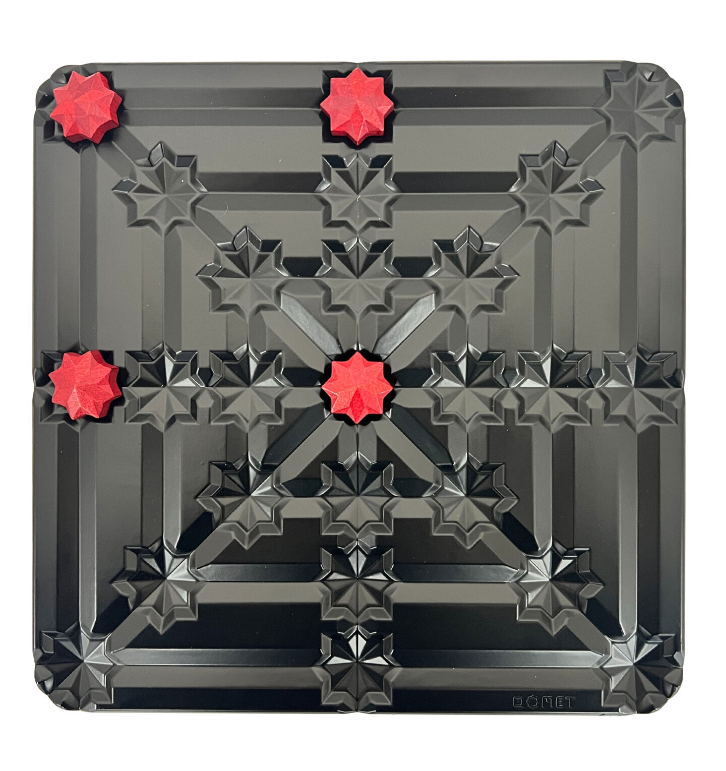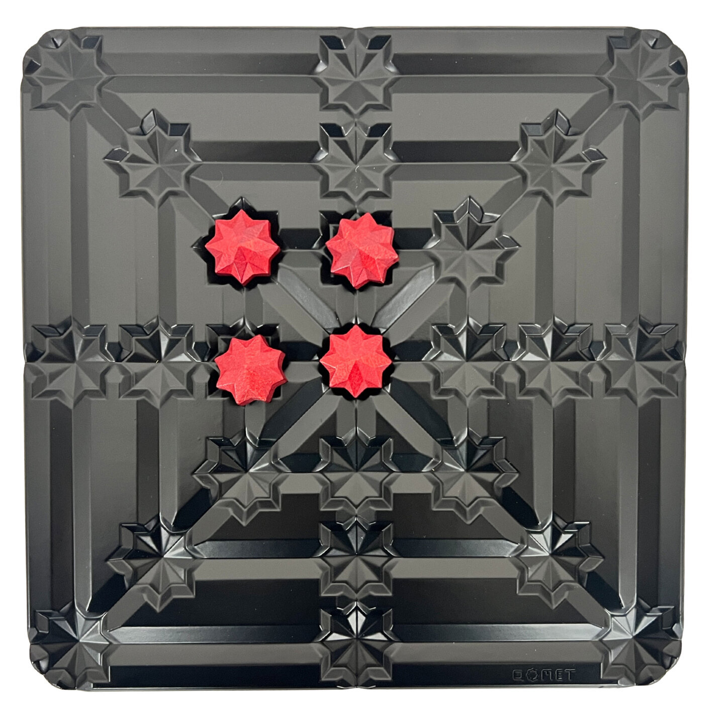 「QOMET(コメット)」は2人対戦のボードゲーム。プレイヤーは手持ちの7つの星(コマ)を使い、25マスのボード上に正四角形を作ることを目指します。位置・大きさともにさまざまな正四角形が成立しうるため、勝利するには広い視野と複眼的な思考が必要です。
