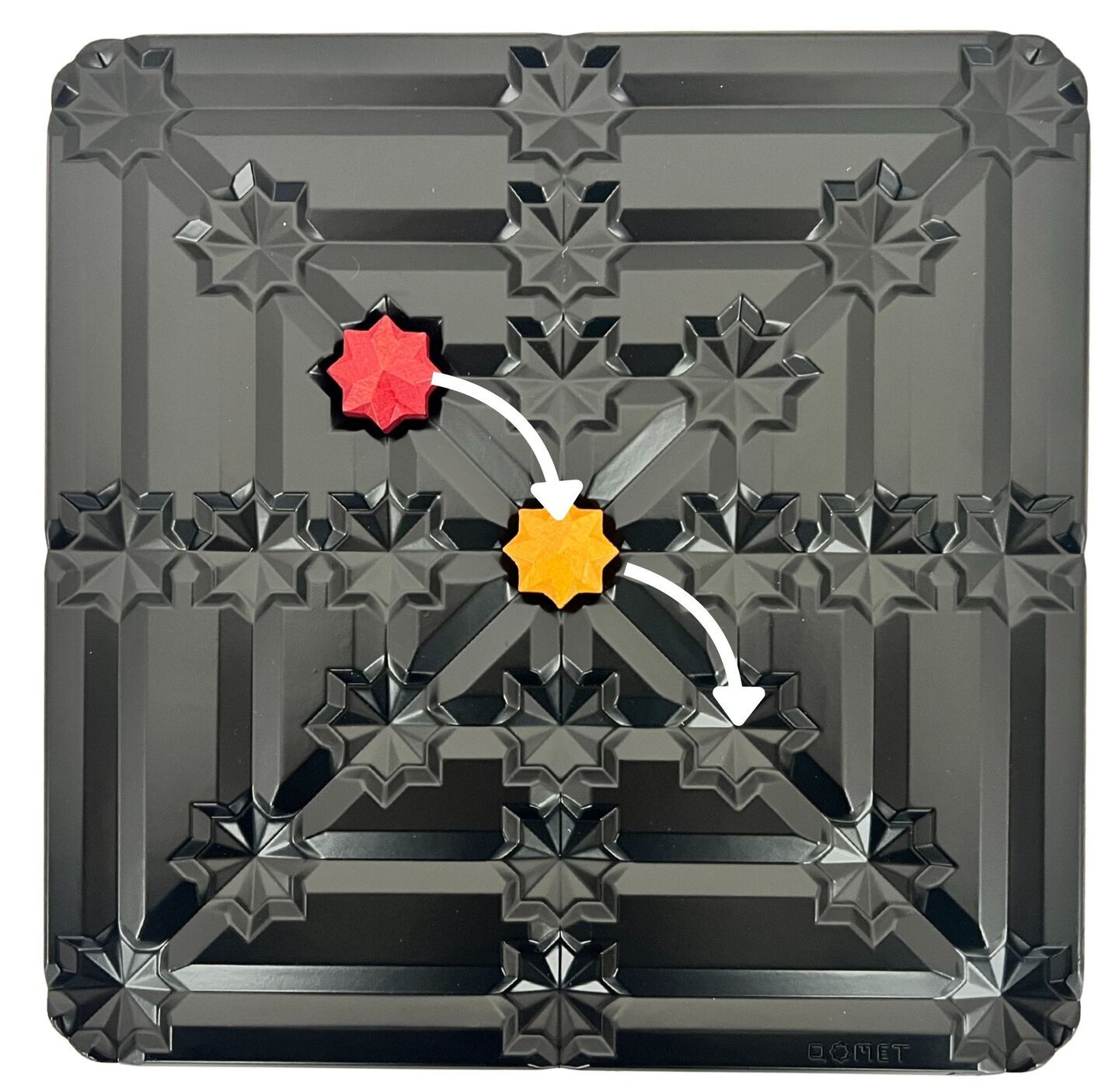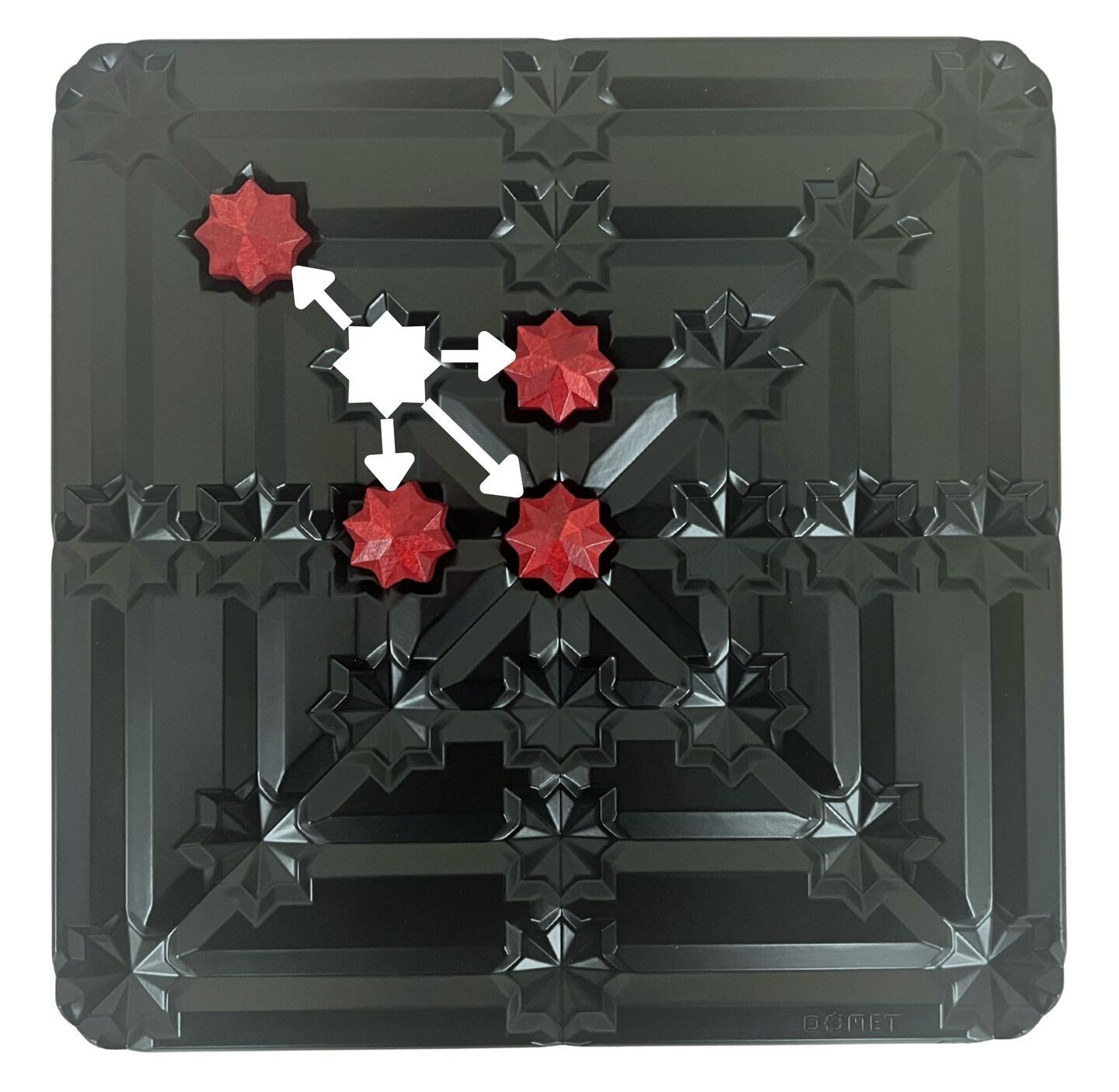 星形のコマをまるで彗星(すいせい [COMET])のようにスライドさせてボード上に正四角形をつくる、新しい四目並べです。正四角形のパターンは大小さまざまなため、1つのアクションごとに展開が変わり、戦略的な思考が求められます。年齢を問わない普遍的な思考力を養う教育ツールとして学校や施設だけでなく、社会人向けビジネス・スキルのツールとして企業での導入もおすすめです。