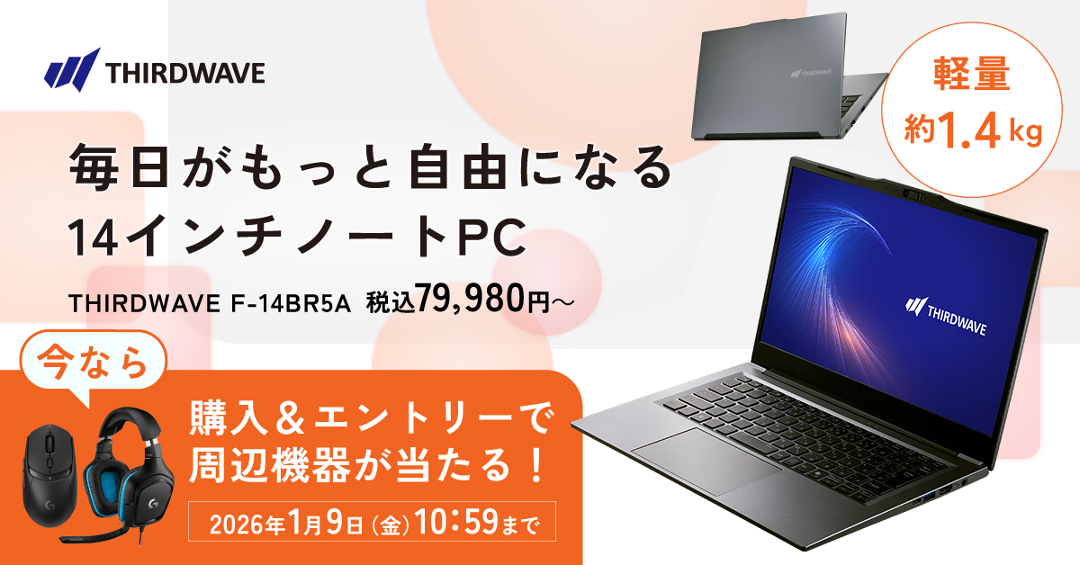 ハイエンドを中心としたBTOパソコンの企画・製造・販売を手掛ける株式会社サードウェーブ(取締役社長 永井正樹 東京都千代田区)は、14インチモバイルノートPC「THIRDWAVE F-14BR5A」を、全国のコンピューターショップ ドスパラ各店舗、およびドスパラ通販サイトにて2025年11月13日より販売開始しました。