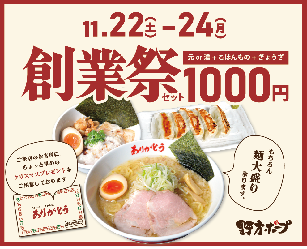 11月22日(土)〜24日(月)に野方ホープ全店で開催される創業祭は、ラーメン(元/濃)・お好きなごはんもの・ぎょうざのセットが1,000円(税込)で提供されます。さらに、麺大盛りもサービス。