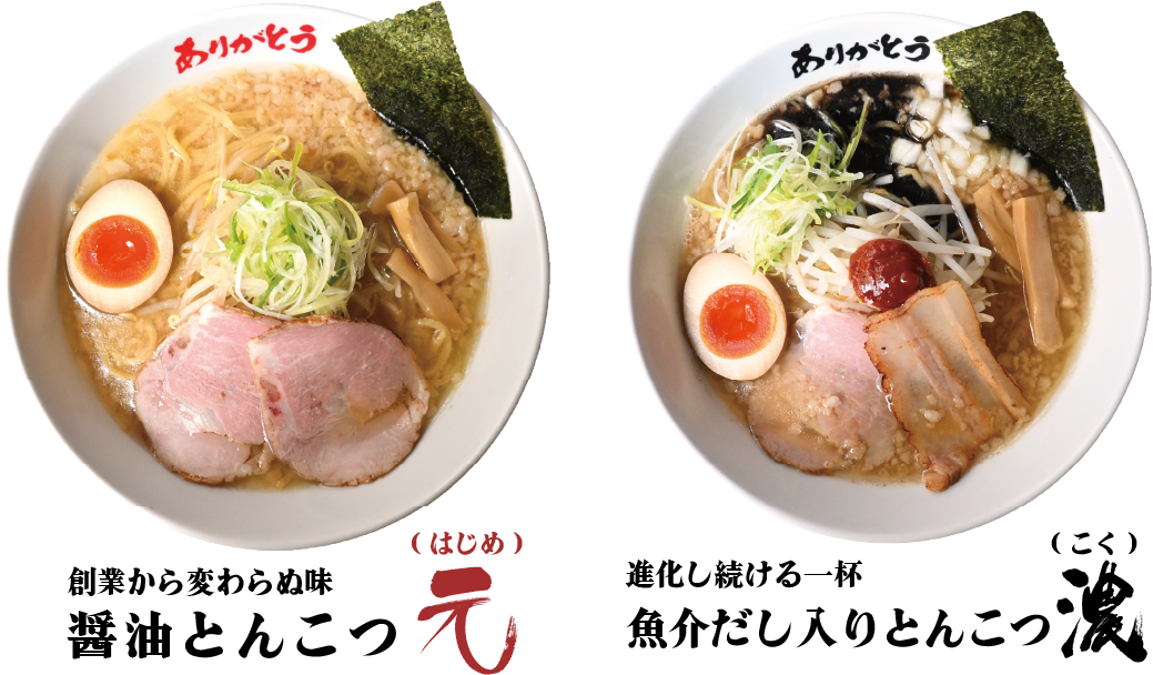 【−創業から変わらぬ味- 醤油とんこつ 元-】とんこつ、鶏ガラ、香味野菜に野菜ポタージュを加えたトリプルスープが特徴です。背脂のコクと甘みが広がる一杯で、麺には中太麺を使用しています。