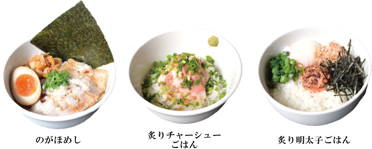 背脂とにんにく醤油漬けがのった「のがほめし」、低温調理でしっとりやわらかい「炙(あぶ)りチャーシューごはん」、薬味たっぷり・温玉のせ「炙り明太子(めんたいこ)ごはん」