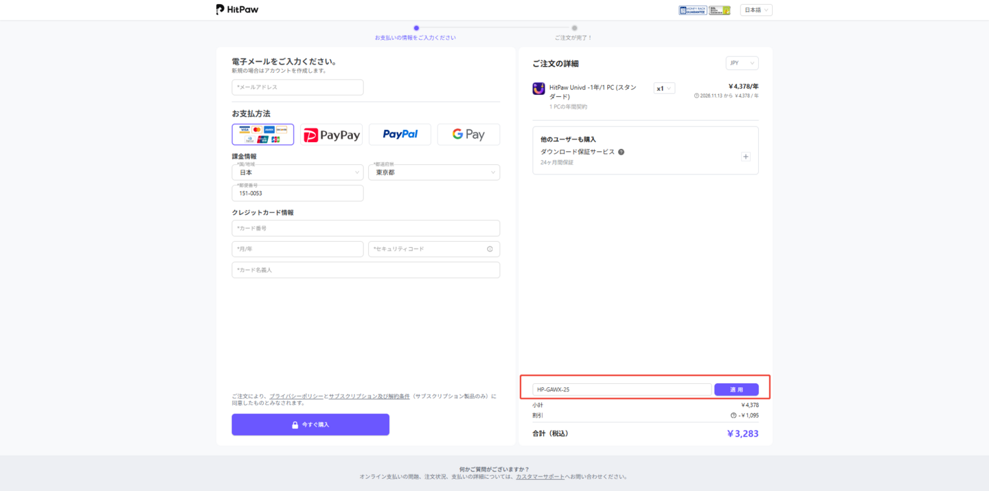 3.購入ページで今すぐ購入をクリックして、支払い情報を入力します。