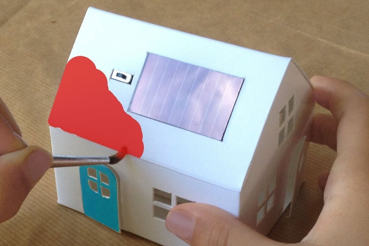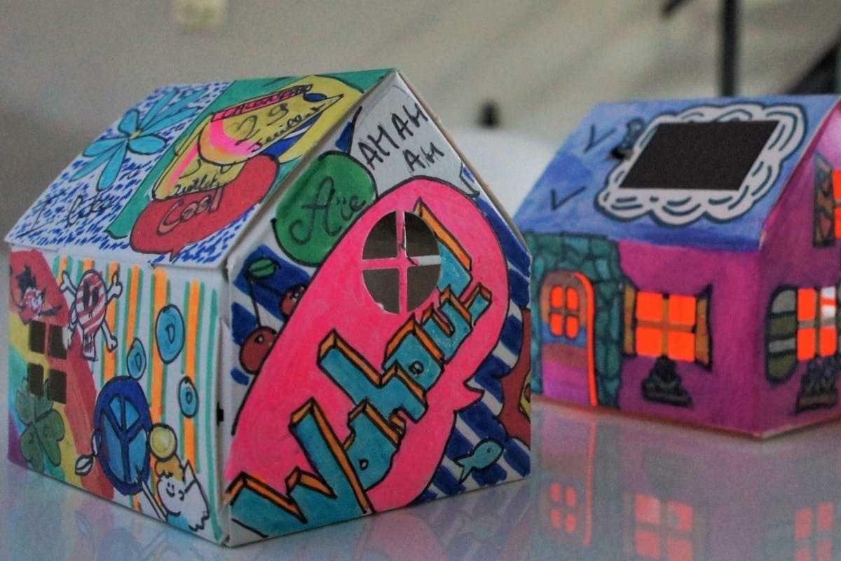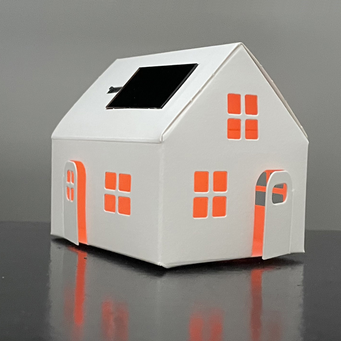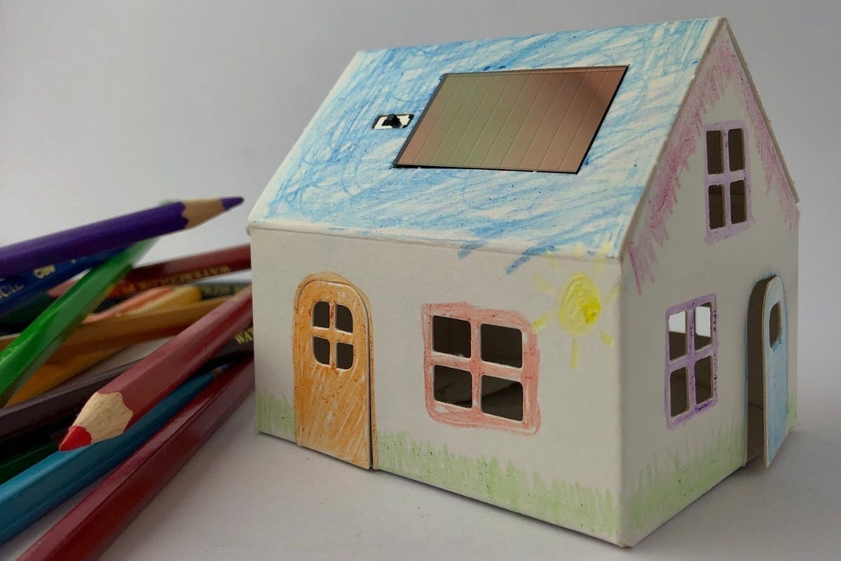 子どもが自分の手で組み立て、絵を描いたりデコレーションしたりして、完成したおうちは太陽の光で充電し、夜にはやさしく灯ります。
