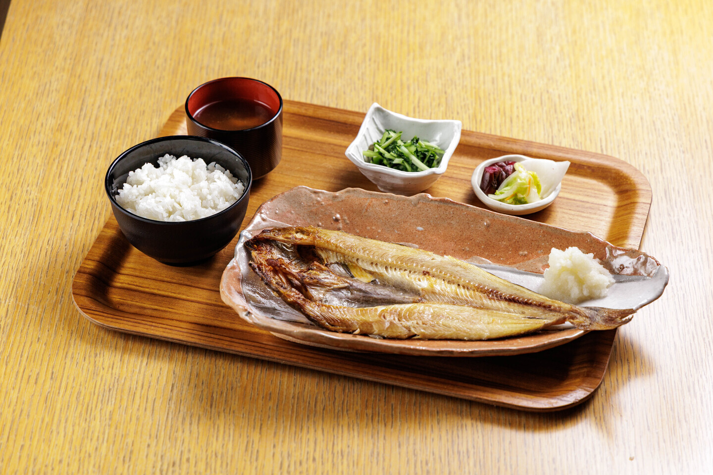 『織り八食堂』では、灰干し製法で作ったほっけ・さんま・あじの干物を提供いたします。