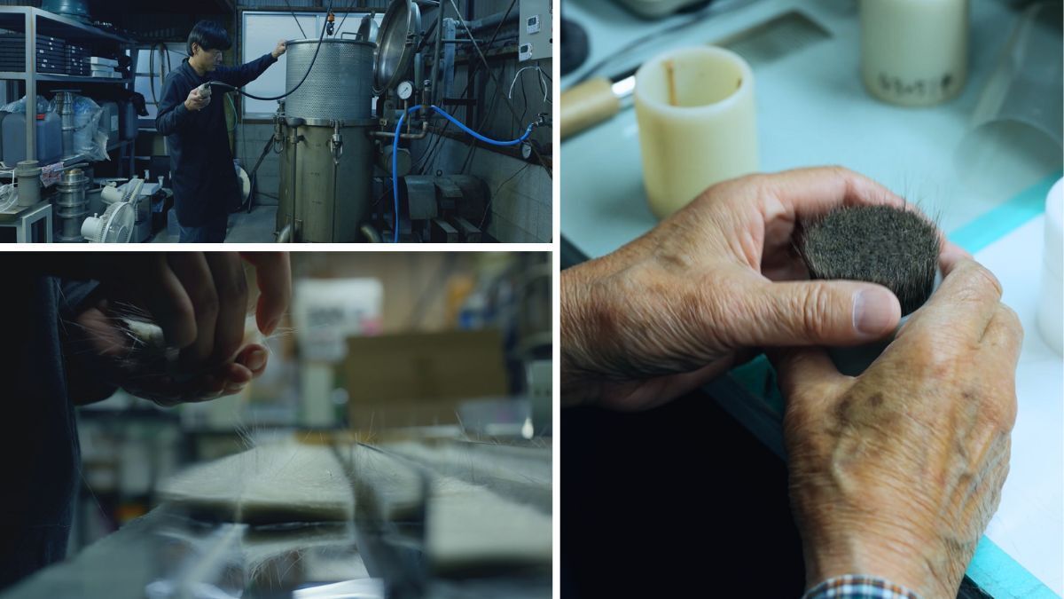 私たちの化粧筆は、自社のオリジナル精毛を施した毛材を使用し、毛先をカットせず自然のままに束ねる方法を採用しています。