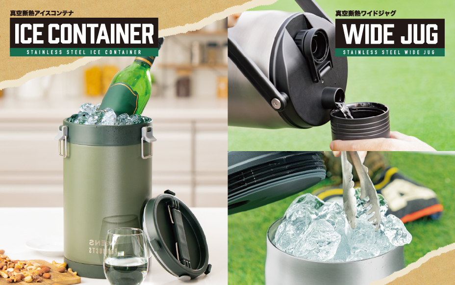 アウトドアでの使用にも耐える機能性を備えた「WENS PRODUCTS(ウェンズプロダクツ)」シリーズに、大容量のアイスジャグ・アイスコンテナが仲間入り。大きな氷がザクザク入る広口の口径で、アイスペールやボトルクーラー、ウォーターサーバーとしても活躍します。4.0Lのアイスコンテナには350mL缶を最大6本入れることが可能です。丈夫なハンドルのほか、底面にはキズを防ぐシリコーンゴム製の底カバーを装備しているため、キャンプ・BBQなどのアウトドアやスポーツシーンで重宝します。