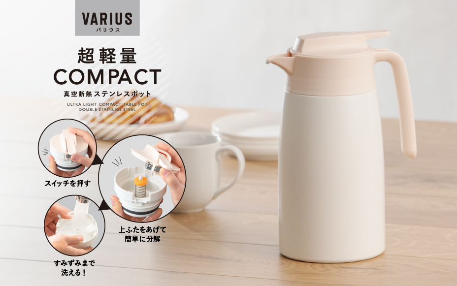真空断熱二重構造により優れた保温・保冷機能を発揮し、オールシーズン活躍する軽量コンパクトな卓上ポットシリーズ。ワンタッチレバーを押すだけで圧抜き弁が内部の圧力を逃がし、軽い力でもスムーズに飲み物を注げます。ふた(中栓)はお手入れしやすい分解式。内びん形状の工夫により中身が残りにくく、注ぎ口は飛び散り・液だれしにくい設計です。ドリッパーを乗せれば直接ドリップも可能。移し替え不要で保温できるため温度変化が少なく、美味しい温度で飲み物を楽しめます。インテリアに馴染むシンプルなデザインとカラーリングの“日常使いにちょうどいい”卓上ポットです。