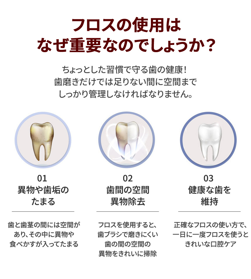 歯茎に最適化されたフロスの厚さを採用して製作しているため、歯が薄く広い構造に関係なく、簡単に異物を除去することができます。