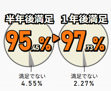 また、治療開始から半年経過後の患者様の満足度は95.45%、そして1年経過後の満足度は97.73%という結果となりました。この調査では、治療開始から6カ月目、12カ月目の時点で患者様が対面診療で来院し、診察の際に薄毛患部の写真を比較して、客観的な効果とは別に、主観的な判断で患者様が治療に満足した物を「満足」、満足しないものは「満足でない」という判定いたしております。