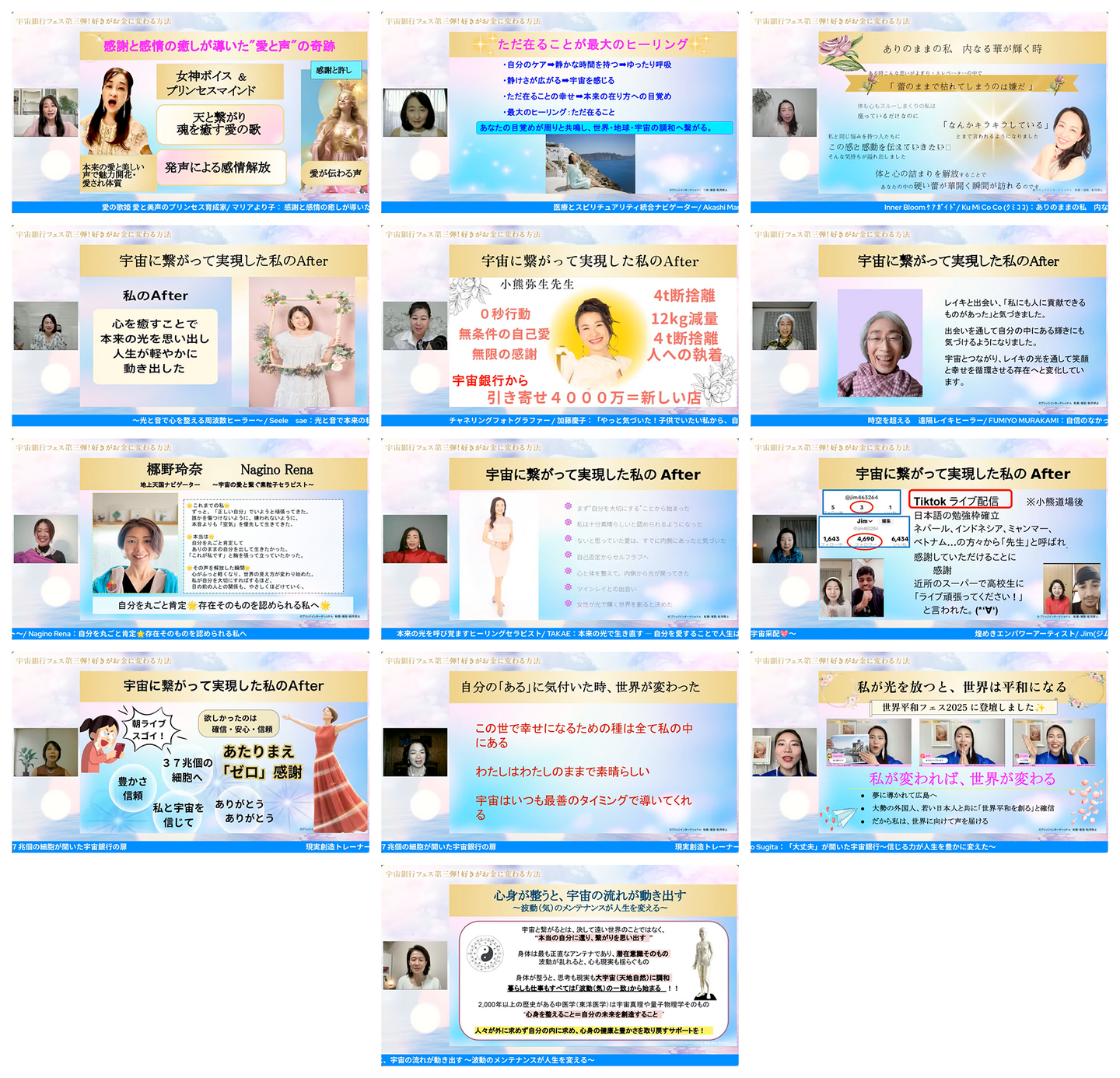 ただ在ることがヒーリングだと説く医師、「私なんて」を卒業した医療従事者、TikTokライバーとして活動する元教師、毎日の感謝で現実が変わった薬剤師、心身が整うと人生が変わると伝える鍼灸師など、13名の女性が体験を話しました。