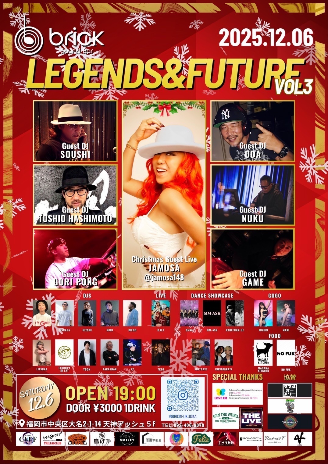 福岡・天神大名エリアのSound Bar BRICKにて、12月6日に『LEGENDS & FUTURE VOL.3 JAMOSA Christmas Live』を開催。JAMOSAが“あの声”を携えてクリスマス・スペシャルライブを披露。DJ SOUSHI、DJ ODA、DJ TOSHIO HASHIMOTO、DJ NUKU、DJ GORI-PONG、DJ GAME、福岡のナイトカルチャーを牽引してきた“LEGENDS DJ”が集結。次世代DJ・アーティスト・ダンサーによる“FUTURE枠”として、DJ HITOMI、DJ WAKASA、DJ DIEGO、DJ LITSUKA、DJ ENTROPY罠EAT、DJ YOON、DJ 2Y、DJ TOM、DJ KOKI、B.G.F、TRED、MM-ASKほか多数が出演。