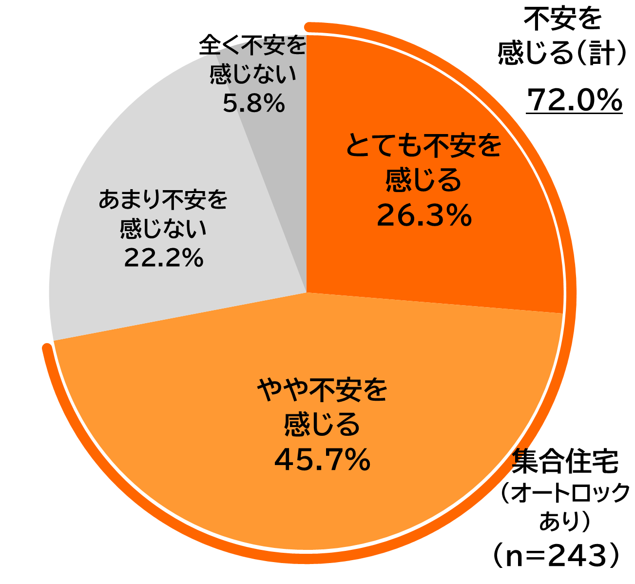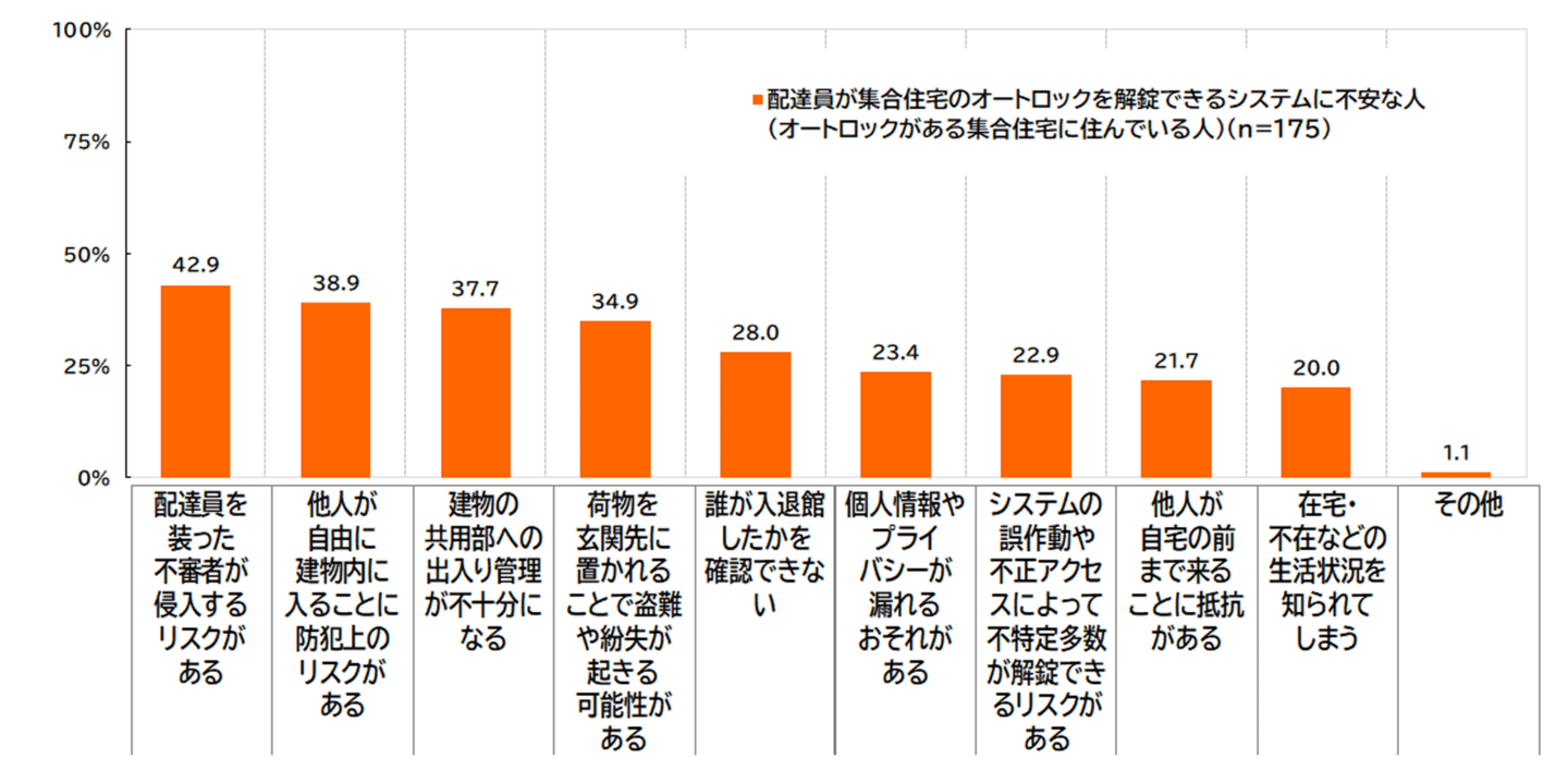 オートロック付き集合住宅に住む243人を対象とした設問では、「配達員による集合住宅のオートロック解錠」について、72.0%が「不安を感じる」と回答。その理由として「配達員を装った不審者侵入のリスク」42.9%、「他人が自由に建物内に入ることへのリスク」38.9%、「建物の共用部への出入り管理が不十分になる」37.7%と、居住者以外がオートロック解錠できることに対する不安が高いことが分かりました。