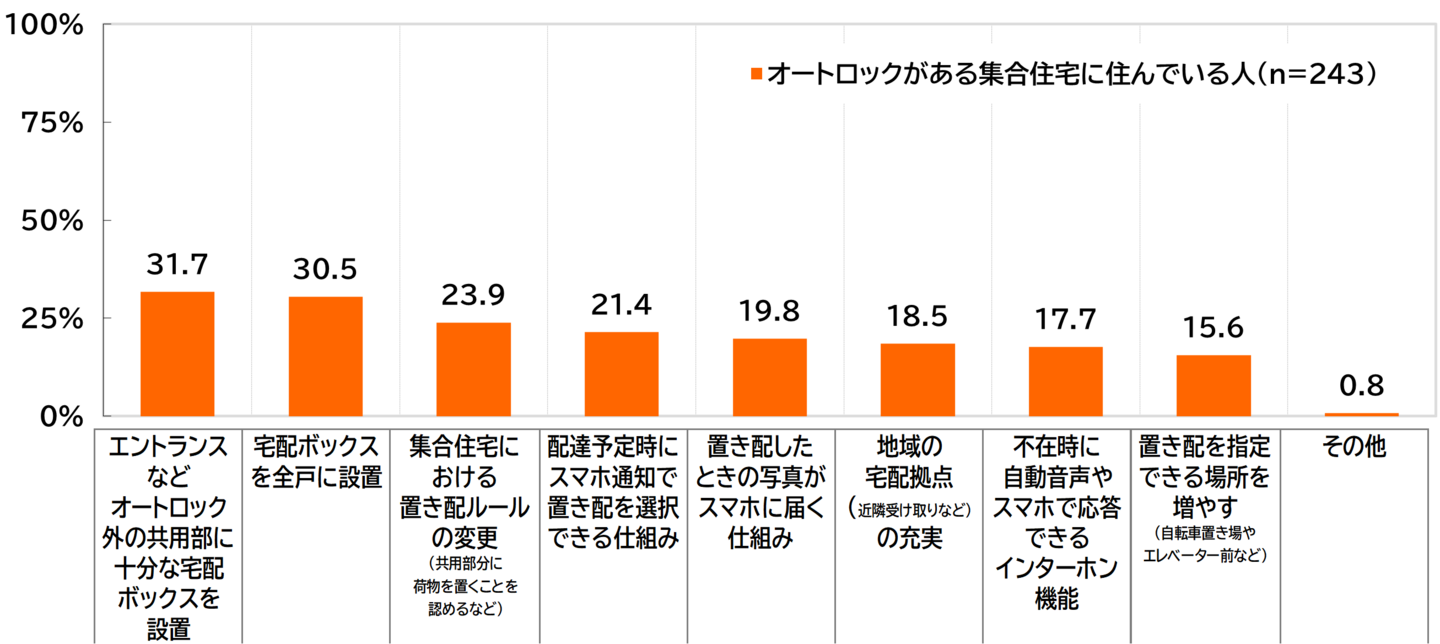 また「オートロック解錠」以外で安心して荷物を受け取れる方法として「エントランスなどオートロック外の共用部に十分な宅配ボックスを設置」31.7%、「宅配ボックスを全戸に設置」が30.5%と、宅配ボックスが全戸で不足なく使用できる環境へのニーズが明らかになりました。