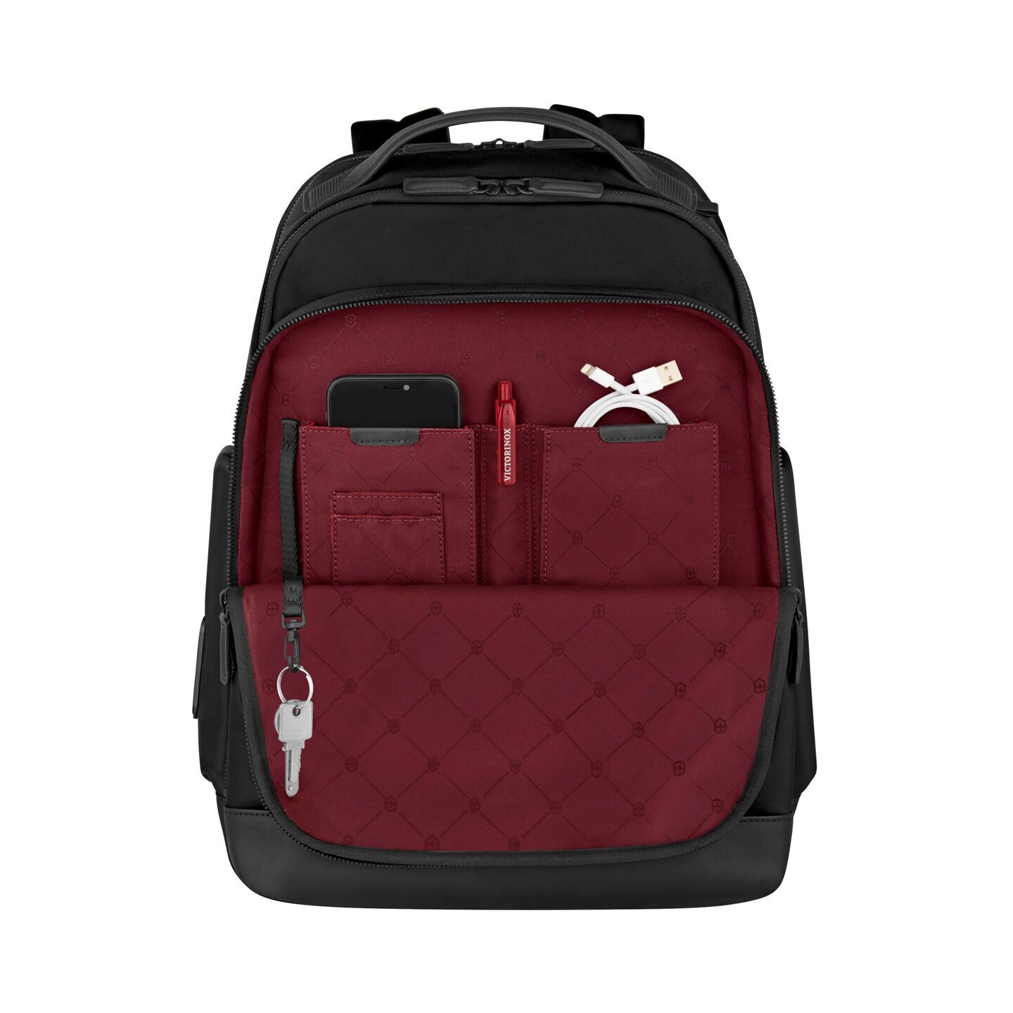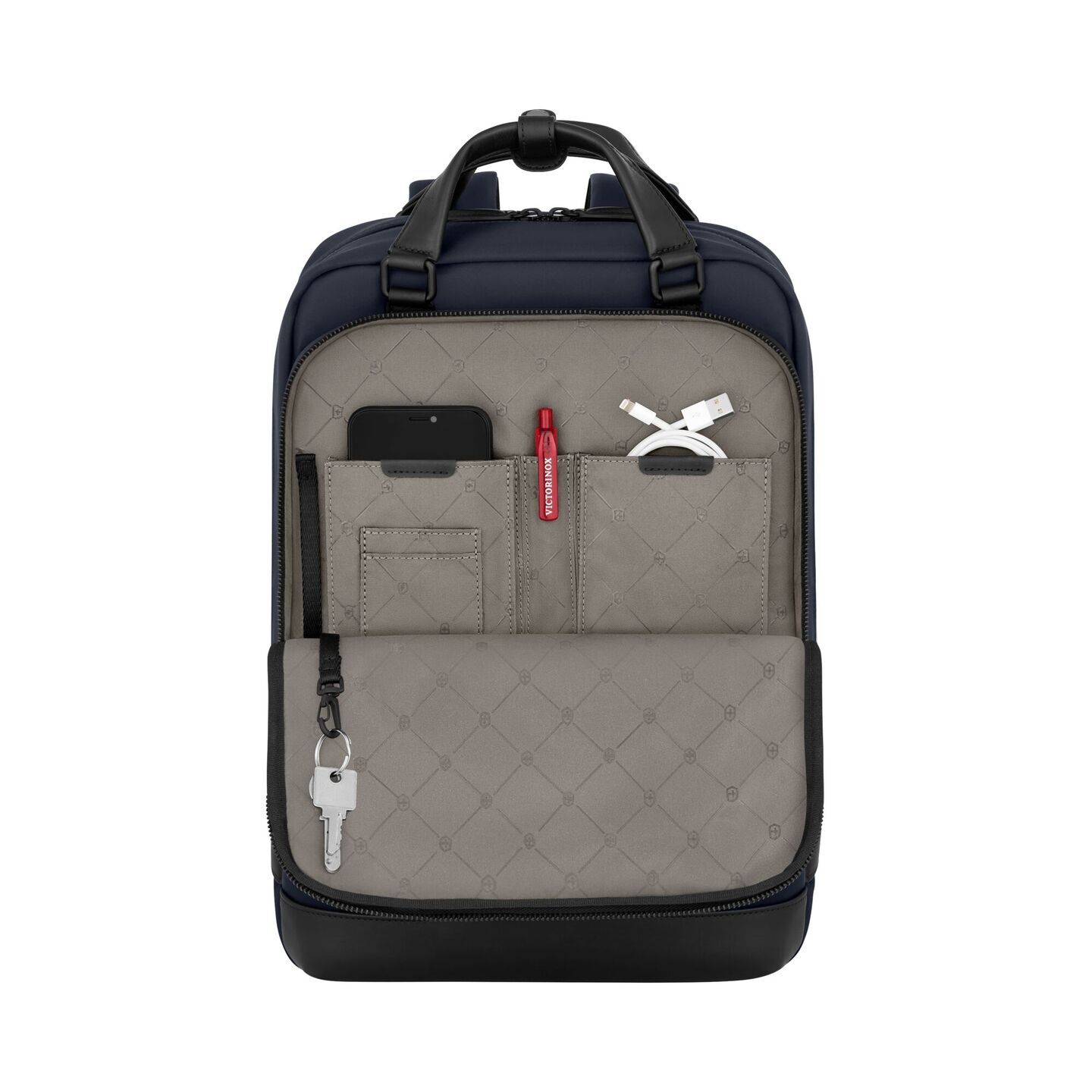 内装のゆったりとしたメインコンパートメントは、15.6インチまでのデバイスを収納できるパッド入りラップトップスリーブ、フリースの裏地を施したタブレットポケット、配置を工夫した傷防止加工ポケットを装備。内部設計にボトル用収納スペースとジッパー式のアクセサリーディバイダーも搭載されています。抗菌裏地のSILVADURがミニマリストなデザインにアクセントを添えます。