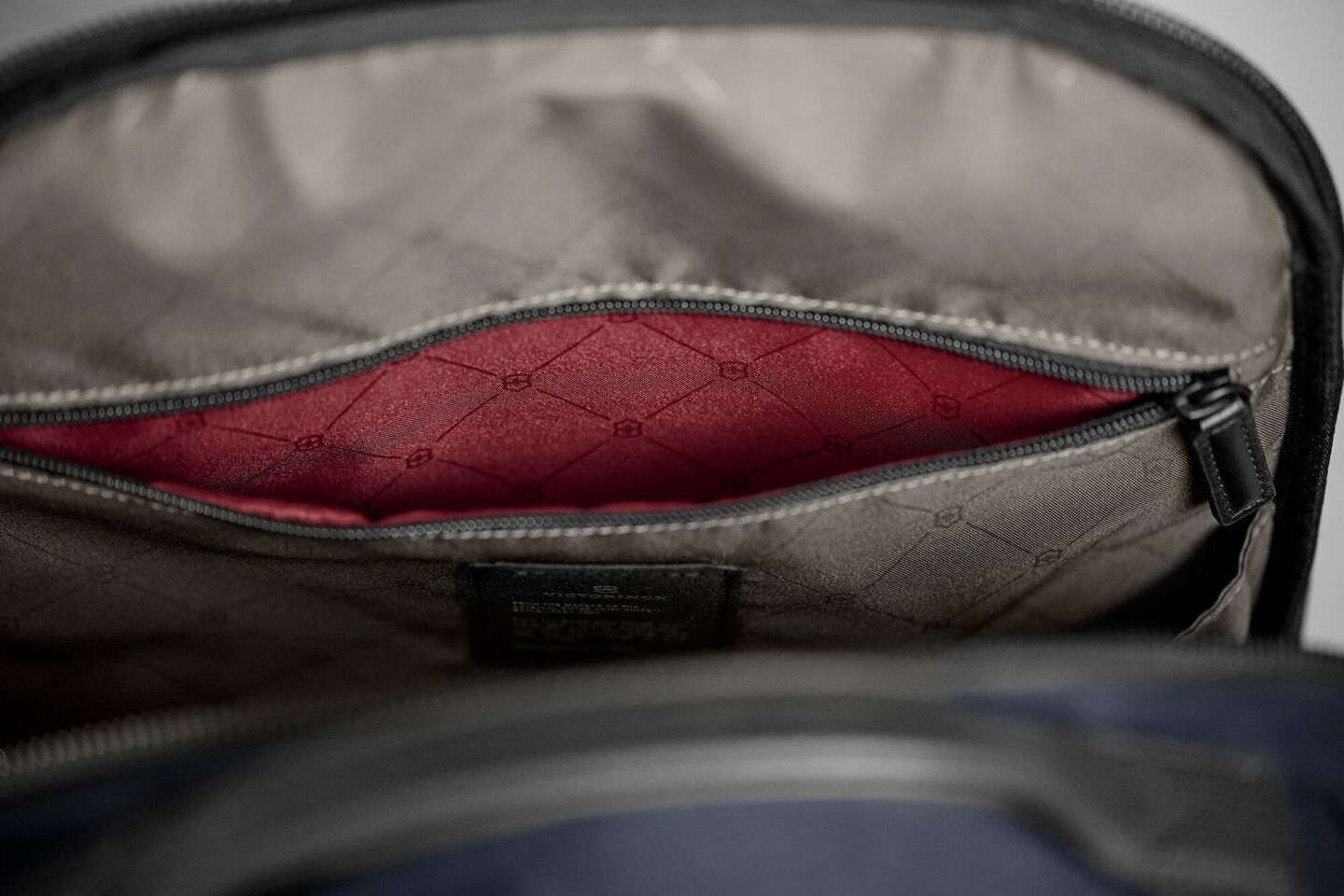 フリースの裏地付きトップポケットには、携帯電話などの繊細なアイテムの収納携行が可能。バッグの内装素材には抗菌生地のSILVADURを施し、エレガントで耐久性に優れています。