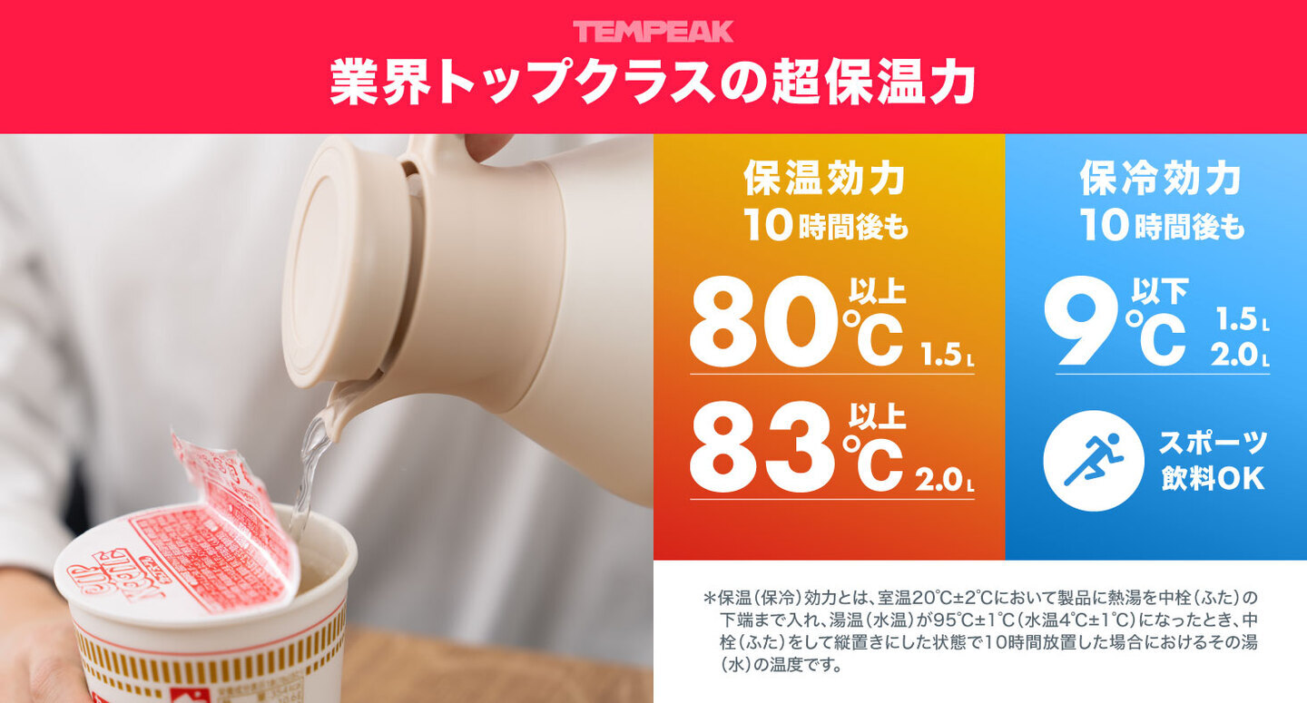 TEMPEAKシリーズの超保温技術を採用した本製品は、10時間後も1.5Lで80℃以上、2.0Lで83℃以上と非常に優れた保温効力を発揮します。一度熱湯を入れれば、長時間熱々のお湯が使用できるため、寒い屋外や火の使えない場所でもカップラーメンを作ることが可能です。