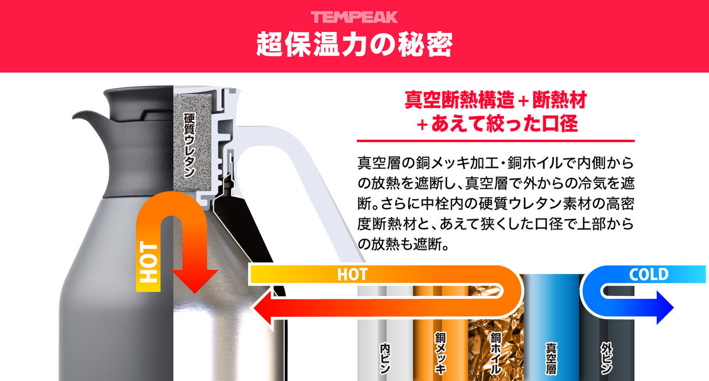 国内最強レベルの保温効力を実現した秘密は徹底した保温設計にあります。本体は内ビンの真空層側の銅メッキ加工、銅ホイル、真空層、外ビンの【5層の断熱構造】です。真空断熱構造で外気温の影響を遮断し、銅メッキ加工・銅ホイルで真空中を電磁波として移動してしまう輻射熱(ふくしゃねつ)を反射して放熱を抑えます。また、上部からの放熱も抑えるために、あえて絞った口径に加え、中栓の断熱材として高密度な独立気泡構造で発泡プラスチックの中でもトップクラスの断熱性を持つ硬質ウレタンを採用しています。
