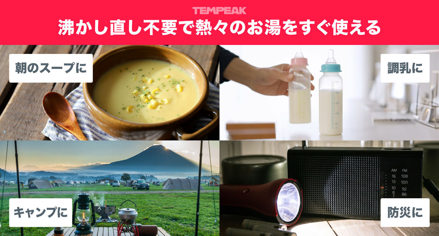 本製品の超保温力なら、再加熱の手間も待ち時間もなく、欲しいときにすぐ熱いお湯を使えます。「朝イチで熱いお湯を使いたい」「夜間の調乳で何度も沸かし直すのが大変」「キャンプや屋外で温かい飲み物を常備したい」など、あらゆる場面で“待たない”便利さを実感できます。