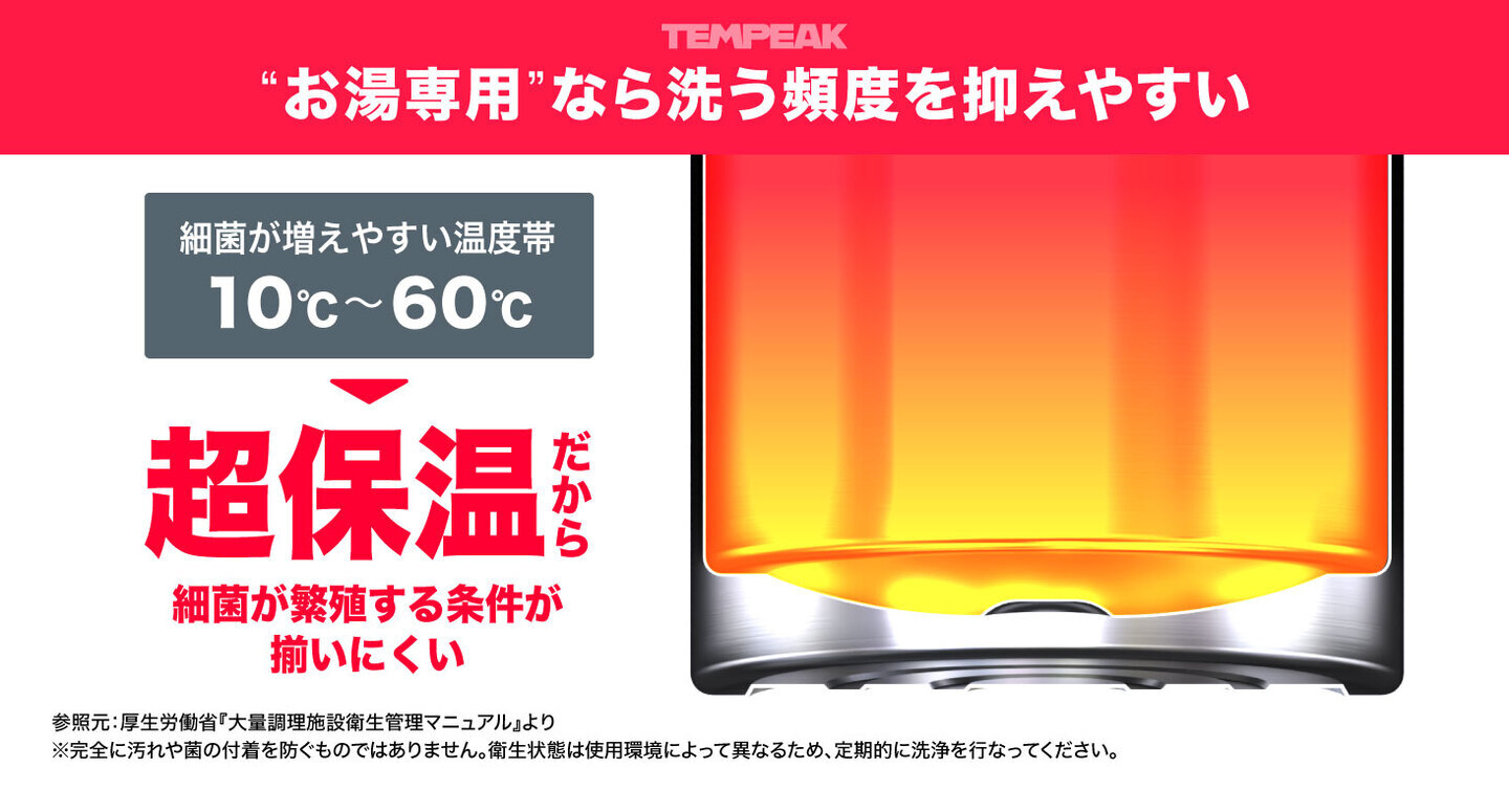 本製品は、長時間で高温で保温できるのが特徴です。食品衛生の分野では、厚生労働省『大量調理施設衛生管理マニュアル』などで、“細菌が増えやすい温度帯(10〜60℃)”が示されており、この“危険温度帯”を外れる高温域では一般に細菌が増殖しにくいとされています。また、内ビンにはニオイや汚れが付着しにくい非多孔性のステンレス素材を使用しており、お湯専用で使用することで、細菌が繁殖する条件が揃いにくくなり、日常的な使用において洗浄頻度を抑えても衛生的に扱いやすくなります。