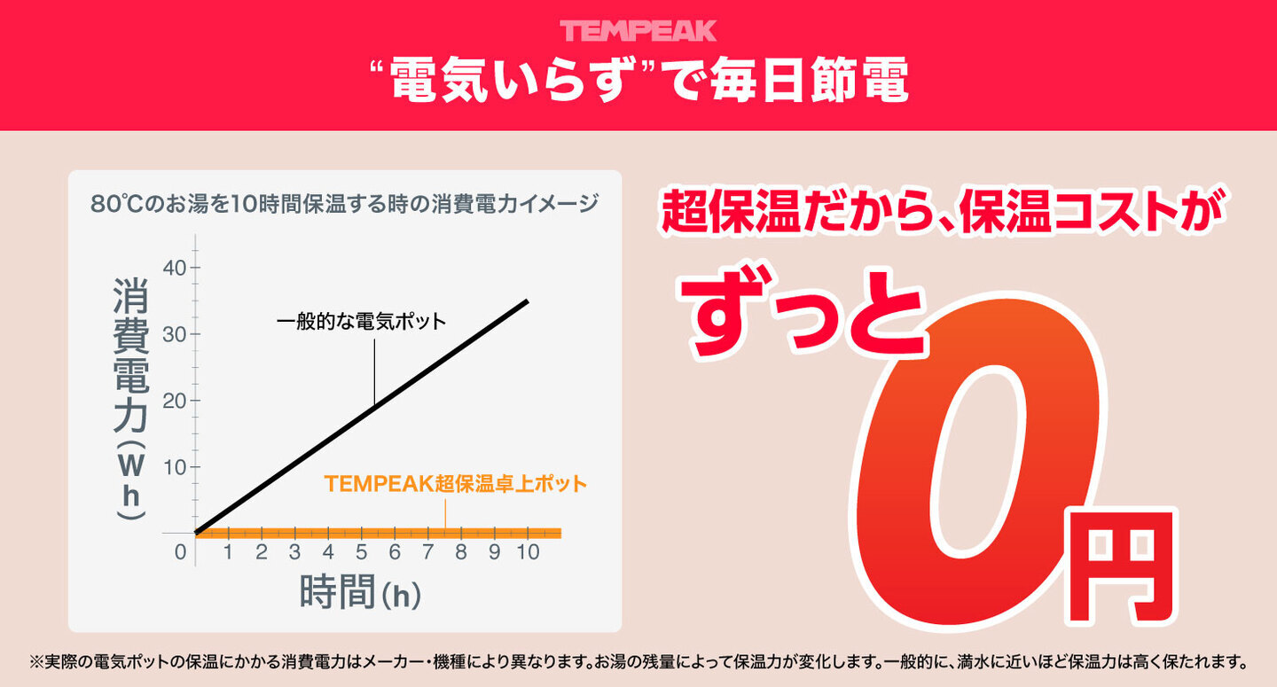超保温構造が熱をしっかり閉じ込め、保温コスト0円で熱々のお湯を常備できます。電気ポットのように常時通電しないため、保温しっぱなしの電気代を気にせず使えるのが大きなメリットです。