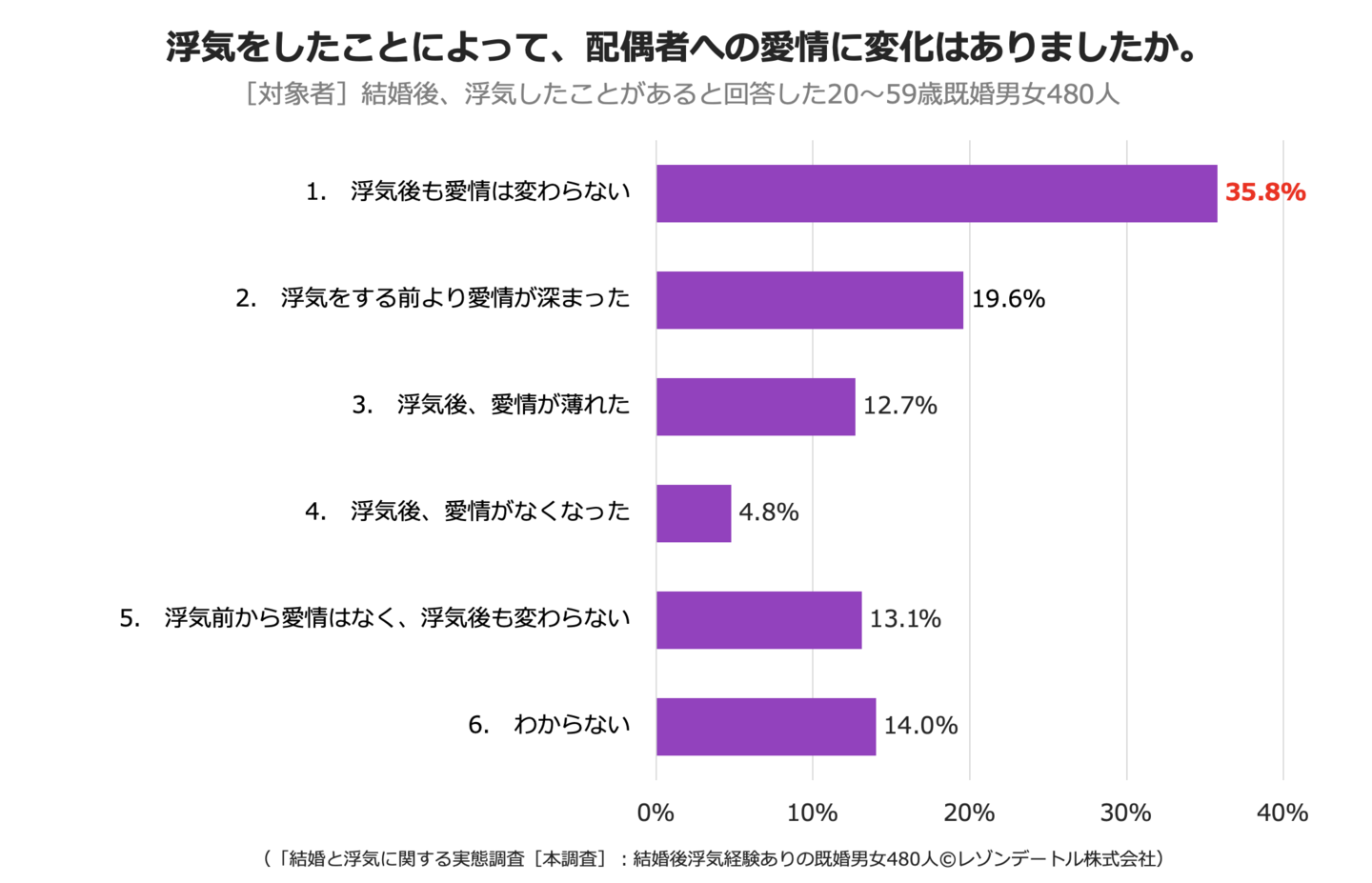 「浮気後も愛情は変わらない」と回答した人が1番多く、約36%の人が浮気しても配偶者への愛情は変わらない結果となりました。