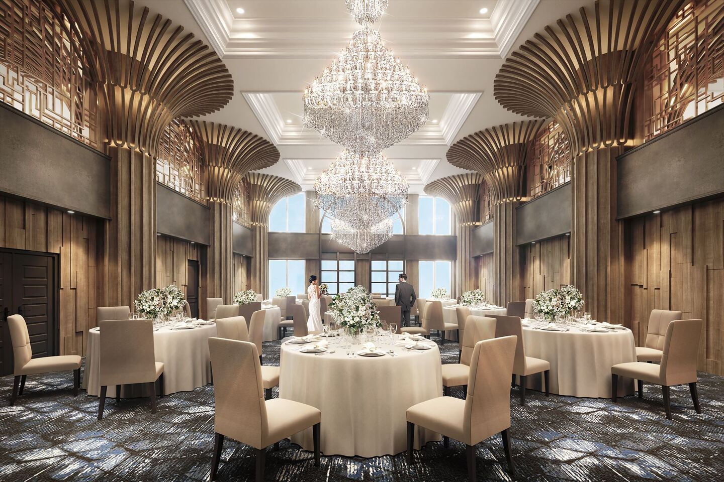 高く伸びる天井から流れ落ちる多層のシャンデリアは、ゲストの歓声が上がるような華やぎを演出し、随所に施された木質アートは、未来へ羽ばたくおふたりを象徴。