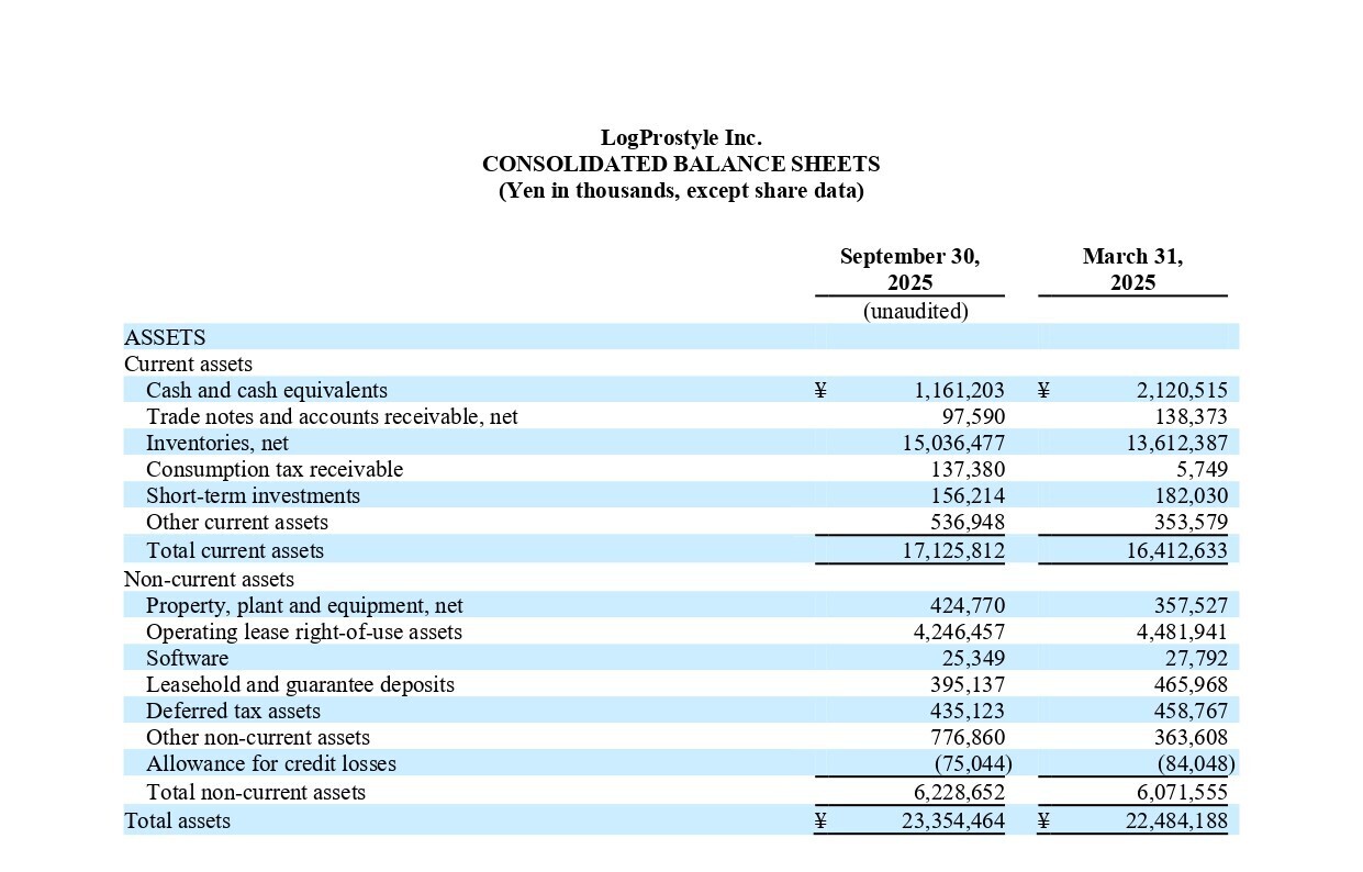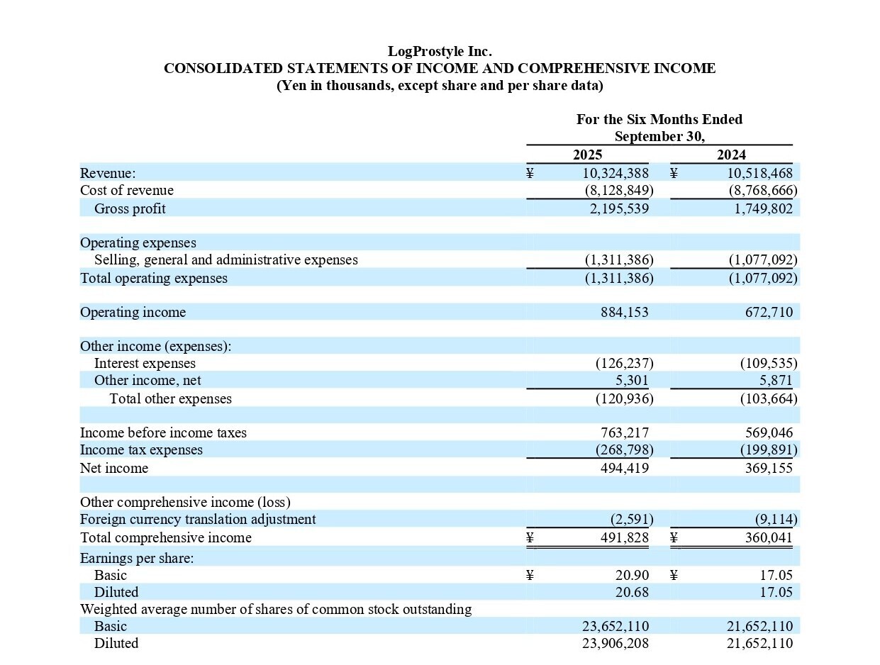 株式会社LogProstyle(NYSE American: LGPS、本社:東京都港区、代表取締役 兼 執行役員社長:野澤泰之、以下「当社」)は本日、2026年3月期上期(2025年4月1日〜2025年9月30日)における決算を発表いたしました。