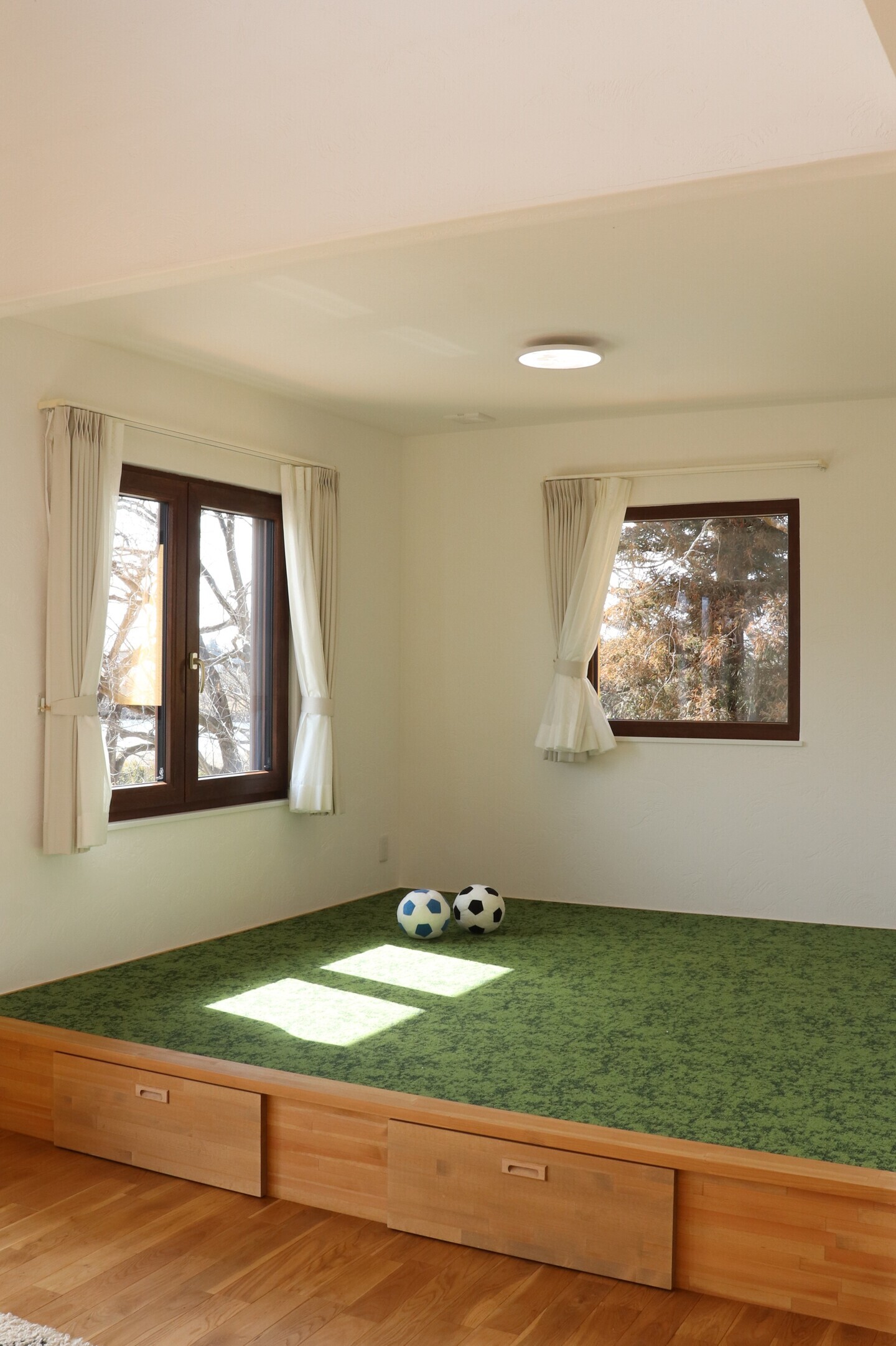 LDKの一角に設けた小上がりは、 座る、寝転ぶ、遊ぶ、くつろぐ――