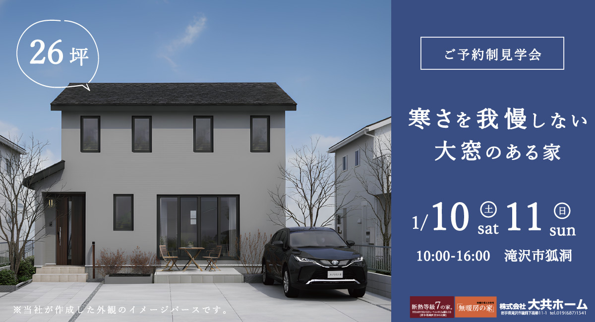 岩手県で注文住宅を手がける工務店の株式会社大共ホーム(本社:岩手県滝沢市、代表取締役:橋本秀久)は、2026年1月10日(土)〜11日(日)の2日間、岩手県滝沢市狐洞にて、「寒さを我慢しない、大窓のある家」の予約制完成見学会を開催します。