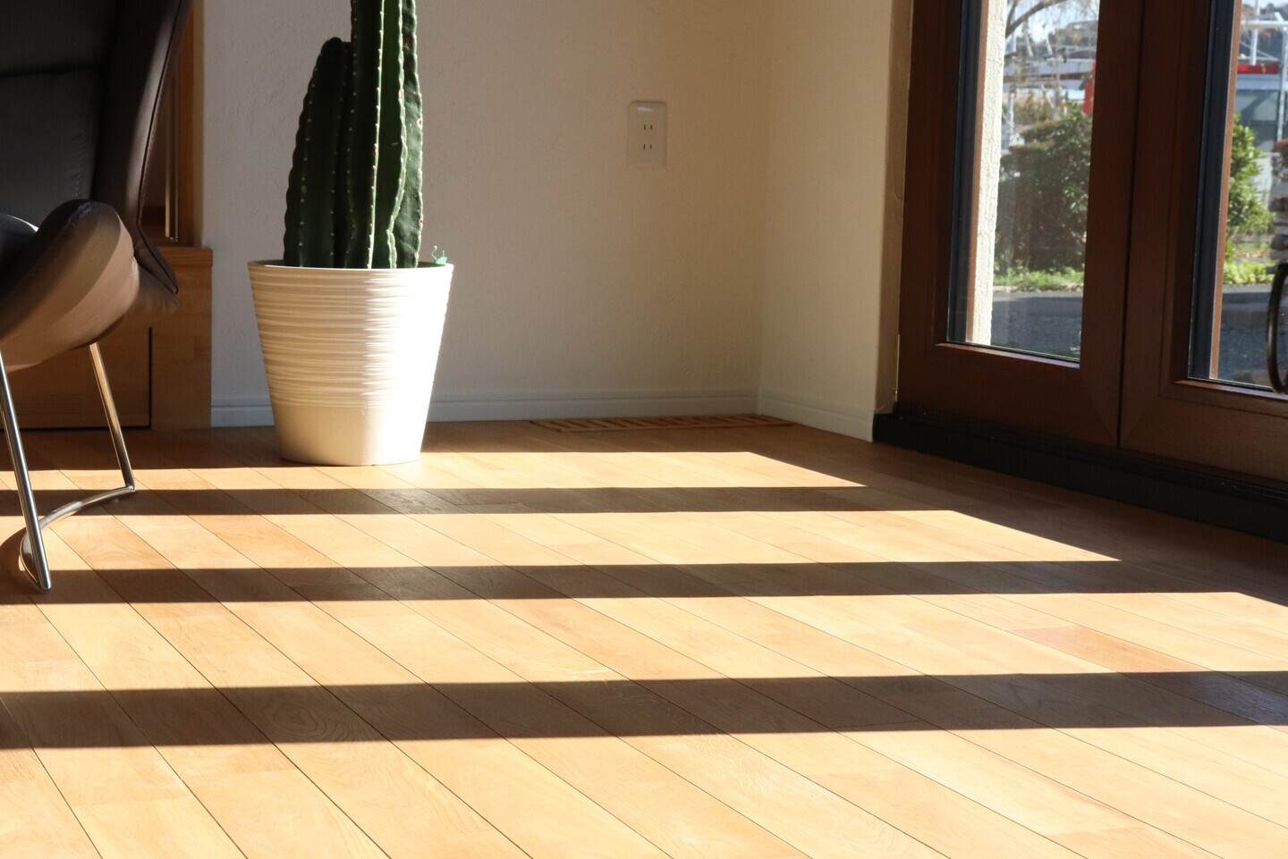 床にはナラの無垢材を使用。 冬の朝でも、素足で立った瞬間に伝わるのは、木ならではのやさしいぬくもりです。