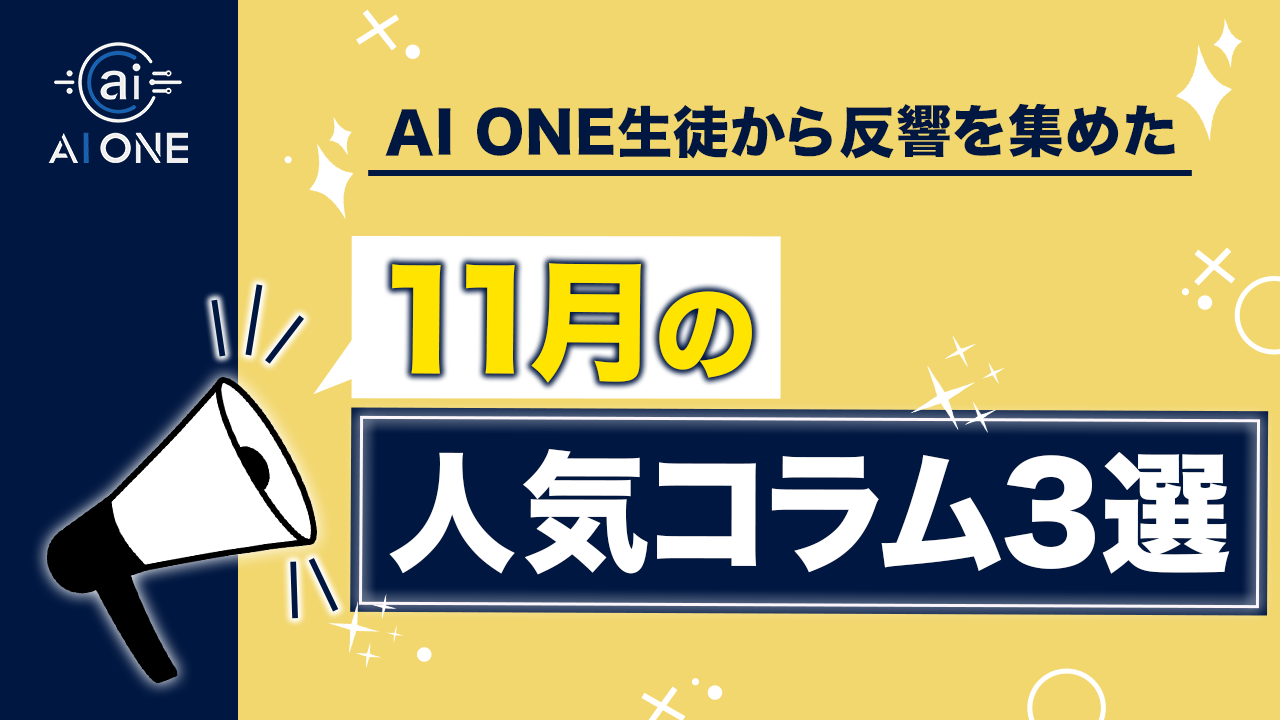 「AI時代の最前線で、あなたの可能性を解き放つ」を理念に掲げ、AIスクール「AI ONE」を運営する株式会社AI ONE(所在地:神奈川県横浜市、代表取締役:森谷和正)は、AI ONEの講師と生徒のみが参加できるオープンチャットを通じて、学習の進め方や考え方を伝えるコラムを定期的に発信しています。このコラムは、日々の学習や行動に悩む生徒が、自分自身の考え方や向き合い方を見直すきっかけとして活用されています。そうした取り組みの中から、2025年11月に公開したコラムのうち、生徒からの反響が特に大きかった「11月人気コラム3選」をまとめました。