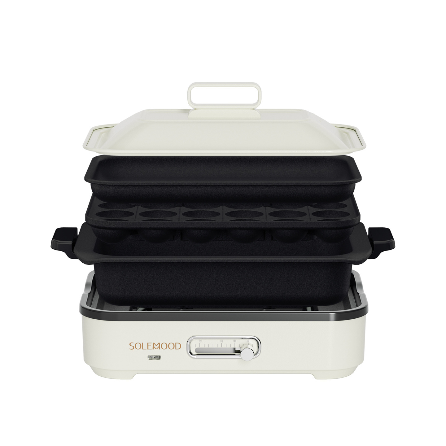 平面・深鍋・たこ焼きの3プレートを付け替えるだけで、焼肉・鍋・たこ焼き・スイーツなど幅広いメニューに対応。コンパクトでも1〜4人分にちょうど良く、パーティーでも活躍します。