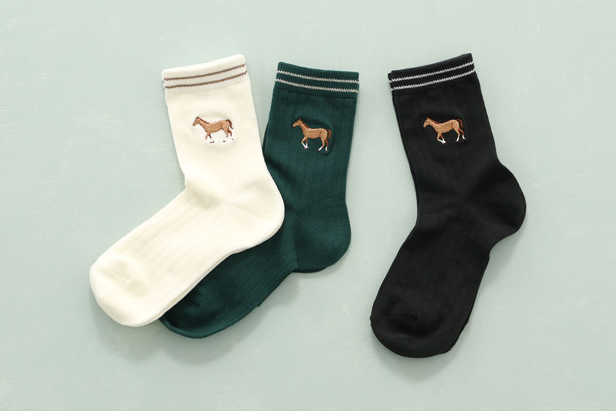 馬の刺繍と、アクセントとして施した2本のラインが映える靴下。