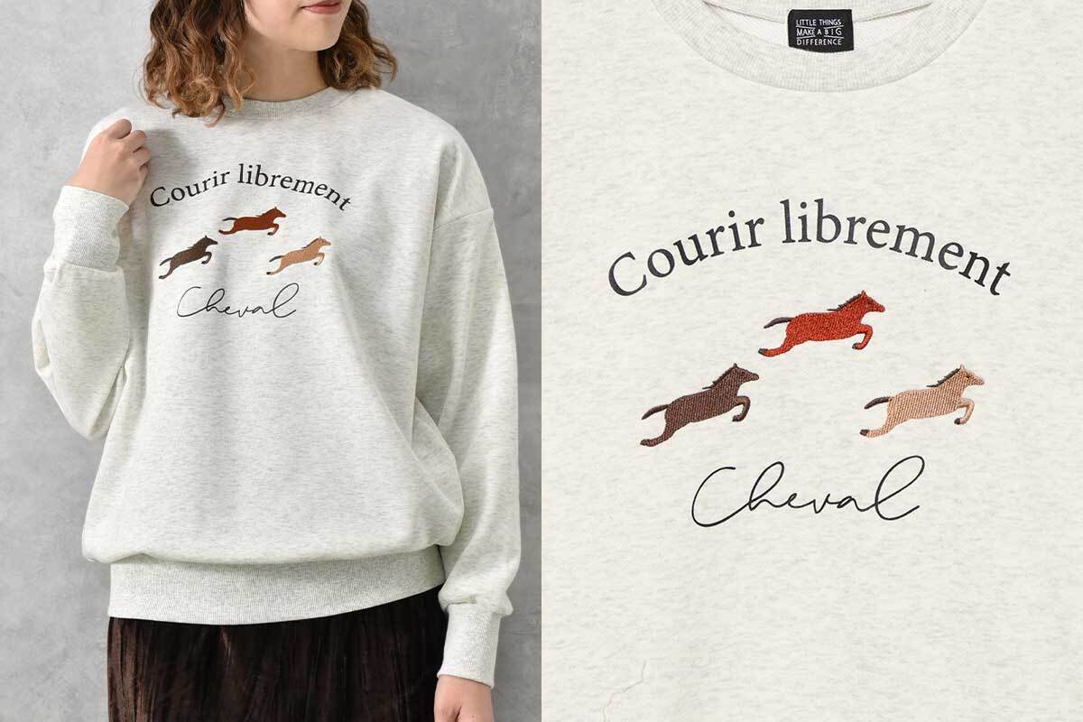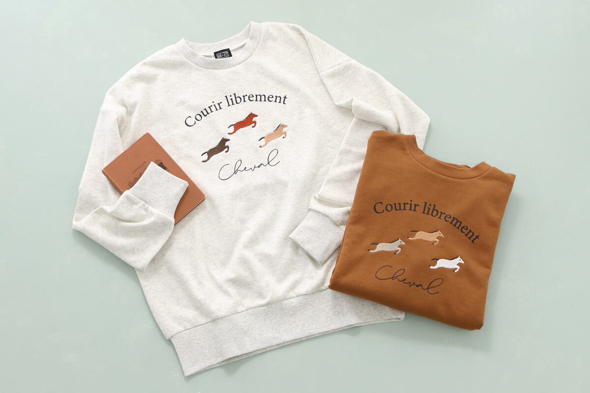 “Courir Librement” は、「自由に走る」「のびのびと駆ける」といった意味を持つフランス語です。空へと駆けるような3色の馬たちが印象的なスウェットは、新しい気持ちで一歩踏み出したくなるような一枚です。