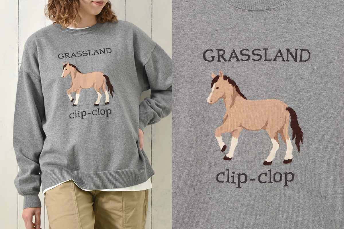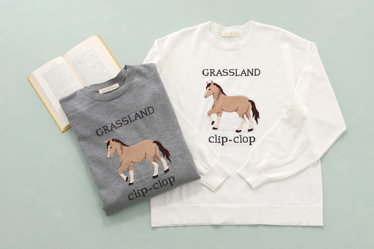 “Clip-clop” は、馬のひづめが地面を歩くときの「パカパカ」「コツコツ」といった軽やかな足音を表す英語の擬音語です。そんな颯爽と歩く馬の姿が、刺繍デザインでそのまま表現されたニット。