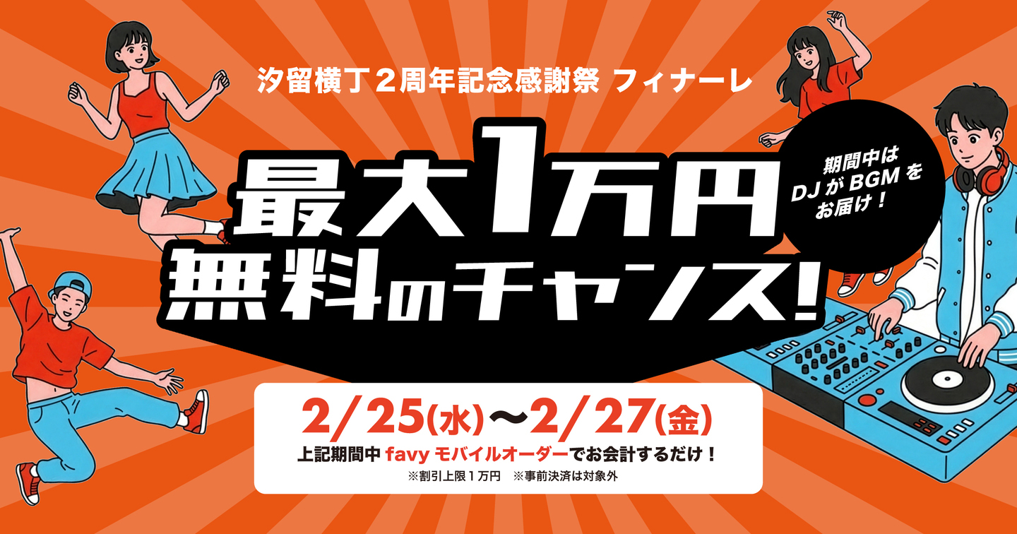 ・favyモバイルオーダー上でのお会計時に抽選を実施。当選した場合、ご利用金額から最大1万円(税込)割引いたします。