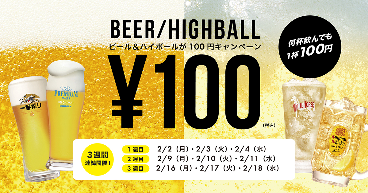 ■ イベント1:大好評!100円ビール&ハイボールが復活