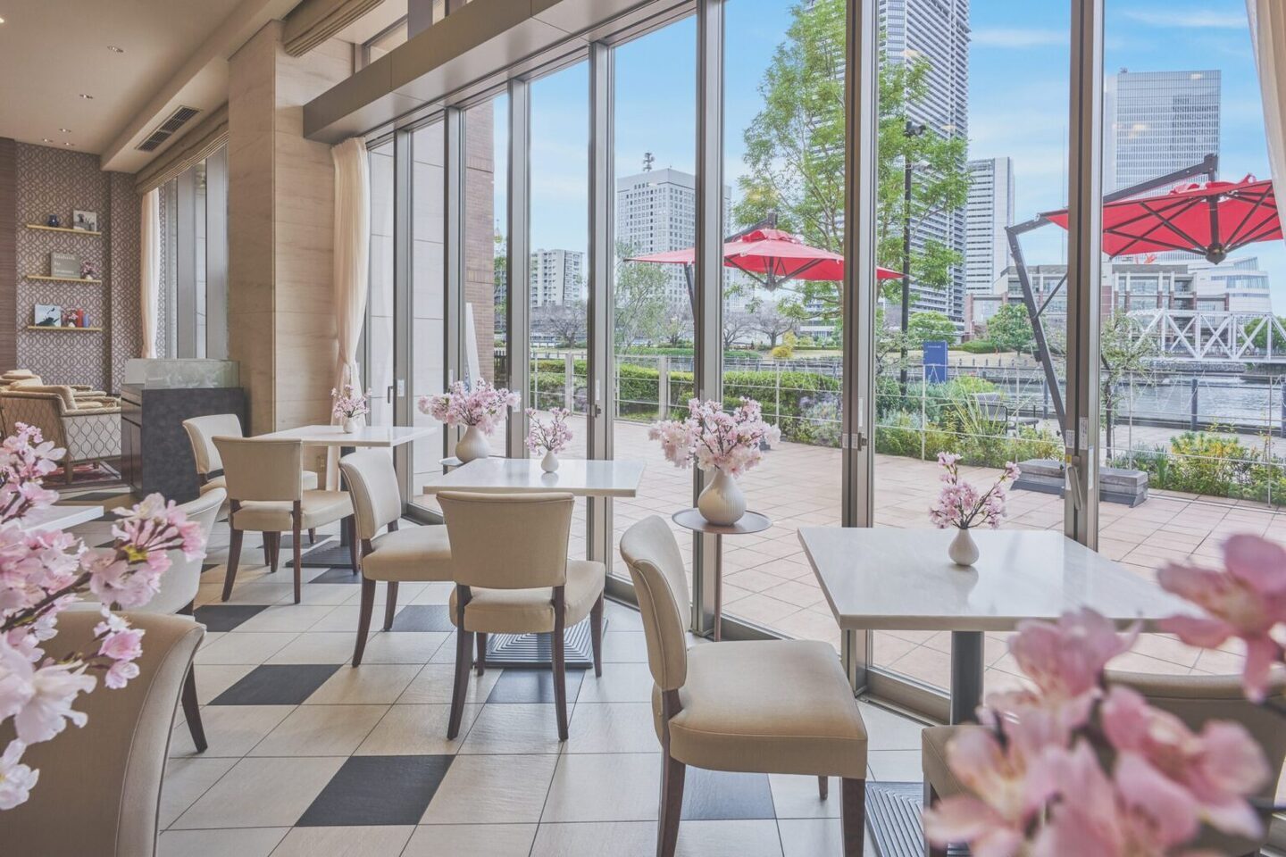 大きな窓の先にはみなとみらいの水辺が広がり、春には汽車道の桜も楽しめるロケーション。甘いスイーツと一緒に、季節の景色も味わえます。