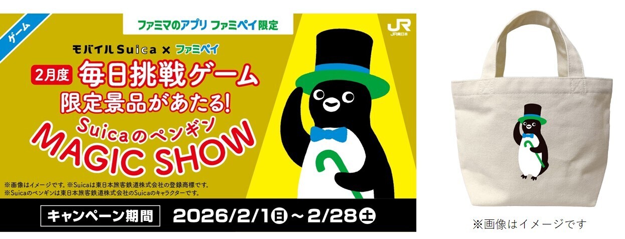 もう一つの注目は、JR東日本との初コラボとなる企画だ。アプリ内の「毎日挑戦ゲーム」では、オリジナルカラーの「Suicaのペンギン 限定トートバッグ」や、クリスピーチキンの無料クーポン、ファミマポイントが総勢962万人以上に当たる。