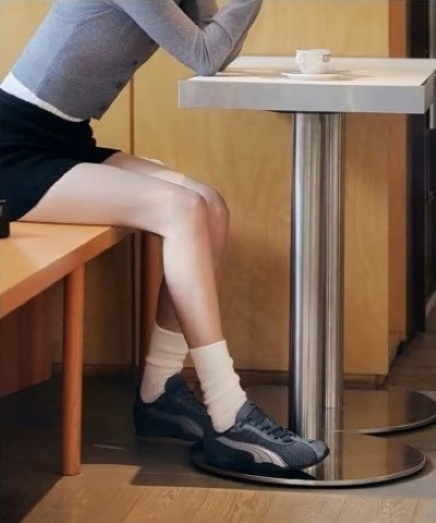 旬のフラットスニーカーを、ミニスカート×白ソックスで韓国プレッピー風に。メッシュ素材で軽く、アクティブなシーンでも活躍の一足。