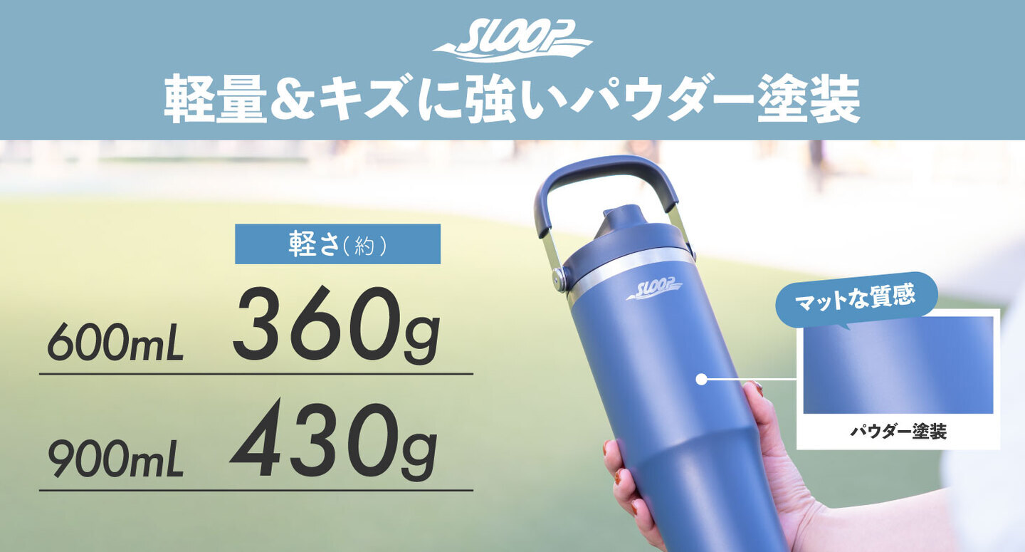 表面にはパウダー塗装を施し、マットで上質な質感に仕上げました。パウダー塗装はキズがつきにくいだけでなく濡れた手でも滑りにくいため、屋外やスポーツシーンでも安心して持ち運べます。見た目の上質さと使いやすさを両立したデザインに仕上げました。