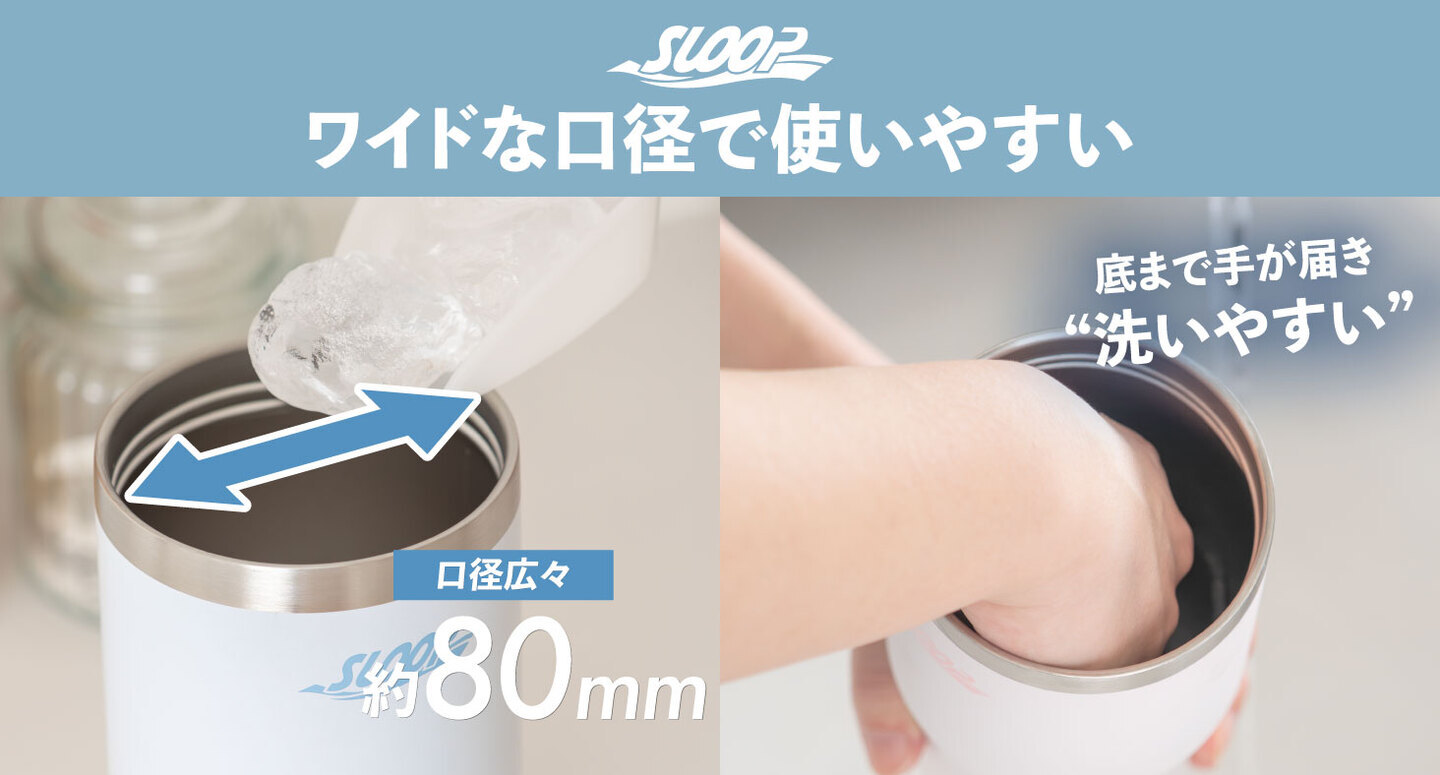 市販の大きな氷も入れやすい約80mmの広口設計なので、手をすっぽり入れて底までしっかり洗えます。