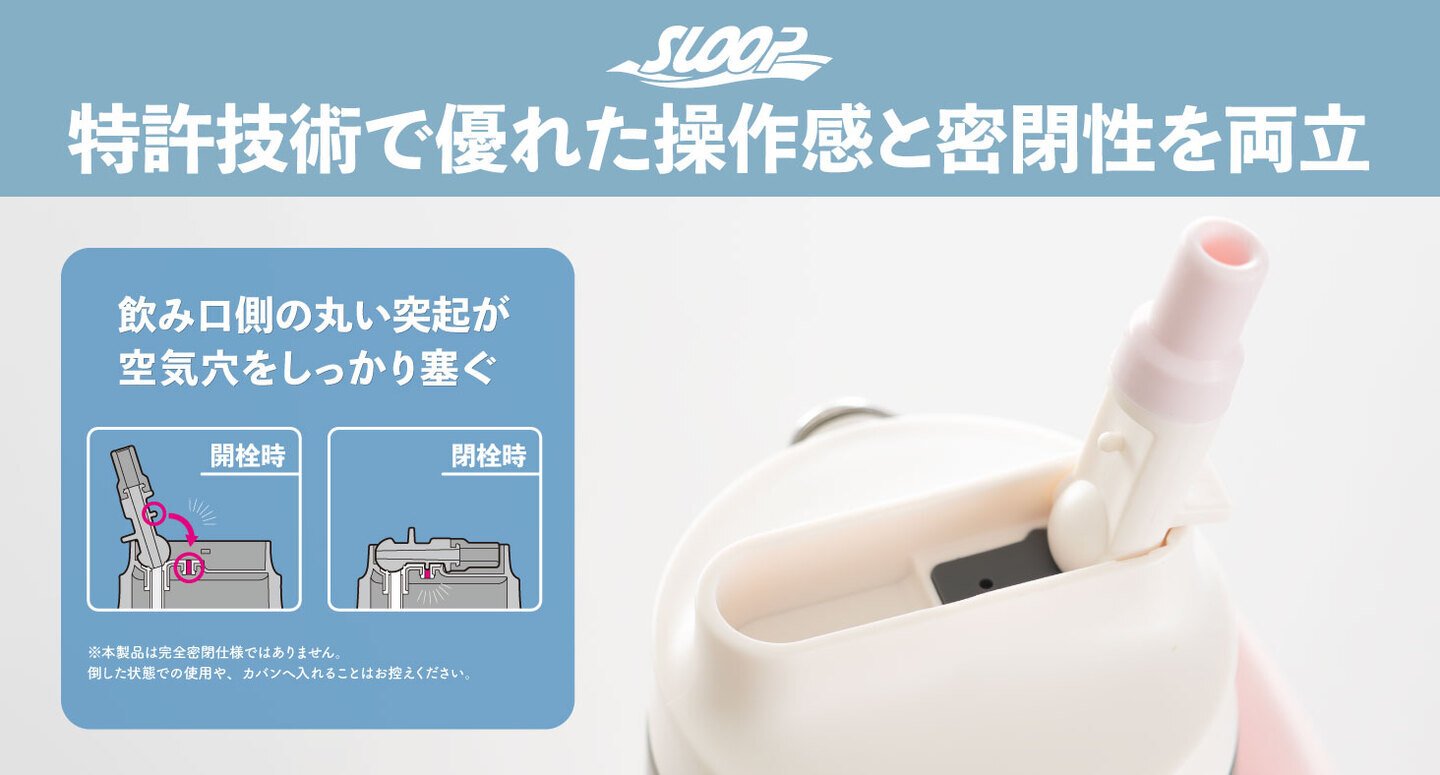 特許取得済みの止水機構は、軽い力で開閉できる操作性と高い密閉性を兼ね備えた独自構造です。飲み口側の丸い突起が空気穴をしっかり塞ぐことで水漏れを抑えられる仕組みになっています。また、閉める時にクリック感があり、ロックの感触が分かりやすいです。操作感と密閉性を両立することで、扱いやすさを実現しました。