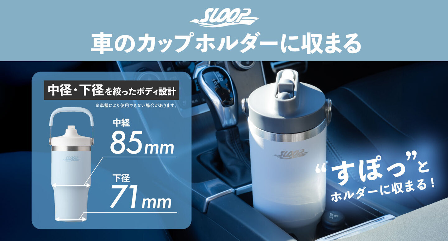 本体の下部と中央部の径を絞ることで、一般的な車のカップホルダーにすっきり収まるよう設計しました。※車種により使用できない場合があります。