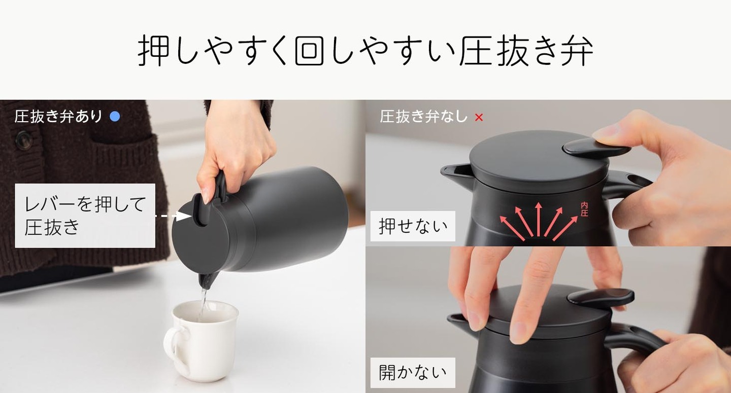 熱湯を入れた際の圧力上昇によるレバーの重みや蓋が開かなくなる現象を解消する、圧抜き弁を搭載しており、レバーを押すことで内部の圧抜きが可能です。内圧による中身の噴き出しも軽減します。